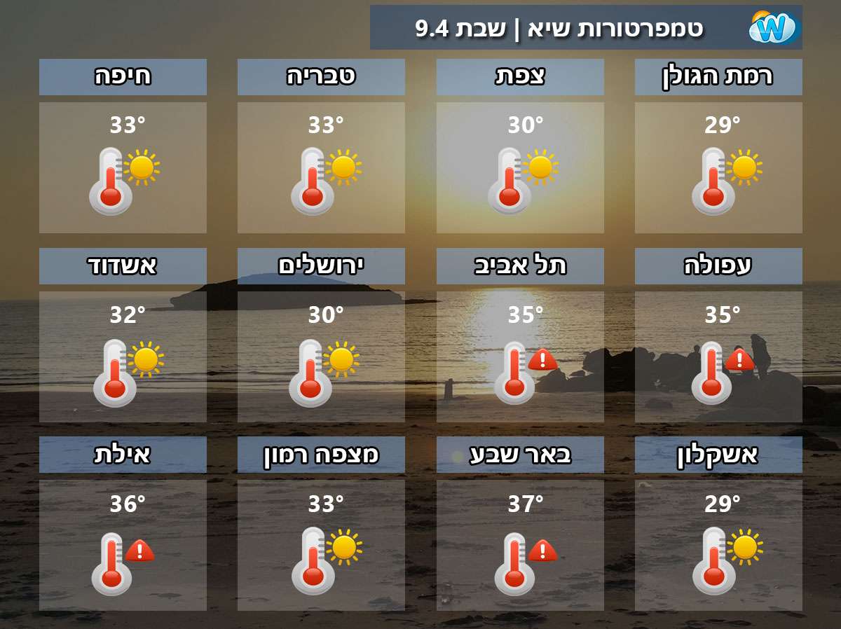 - בשבת שרבי ברוב איזורי הארץ, אלו הטמפרטורות החזויות לשעות השיא Weather2day