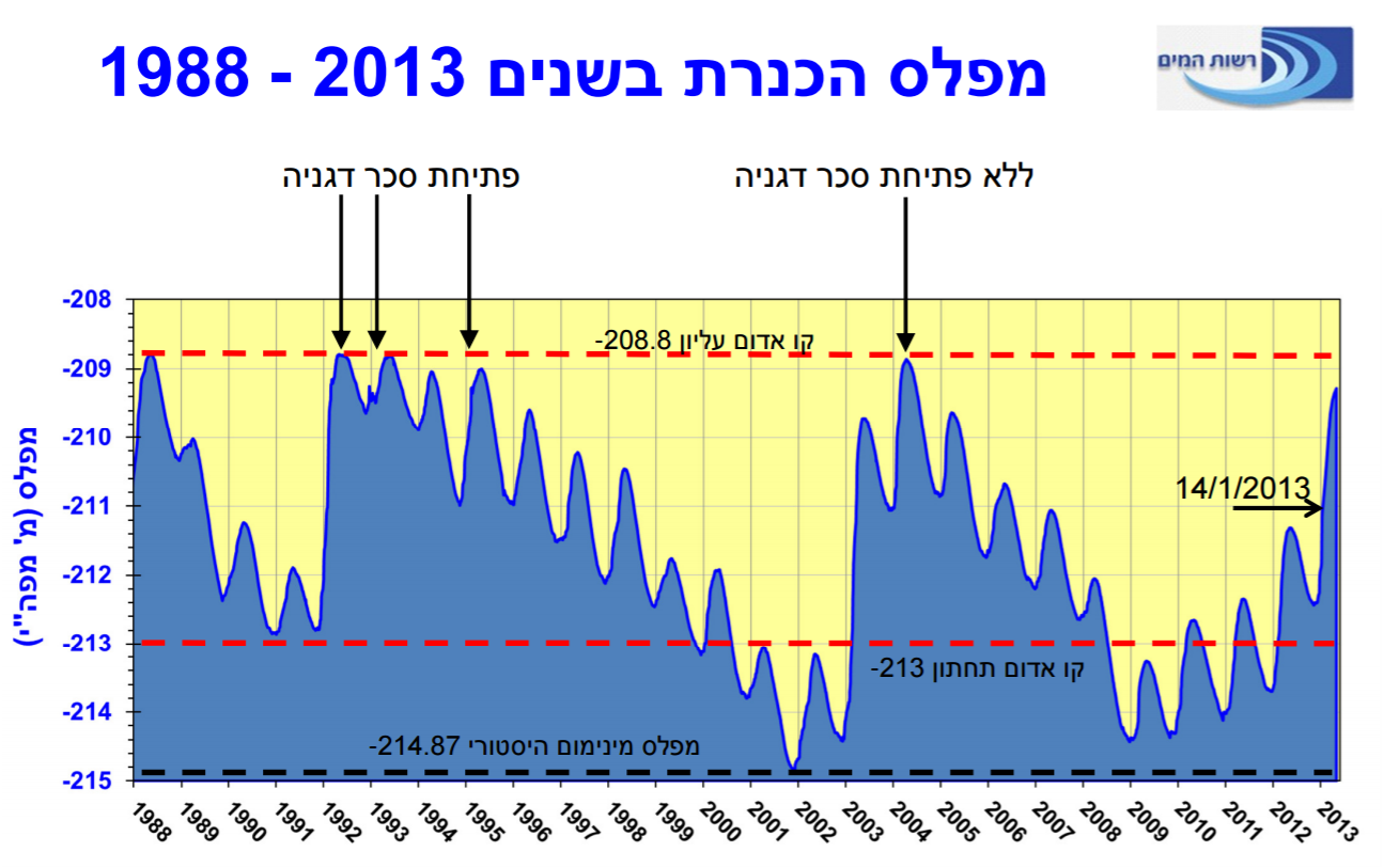 - תרשים מפלס הכנרת 1988-2013 (כולל ציון פתיחת סכר דגניה) Weather2day