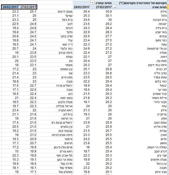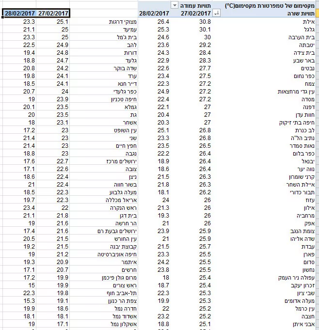 - טמפרטורות המקסימום שנמדדו אתמול , והיום עד 10:40 חובב