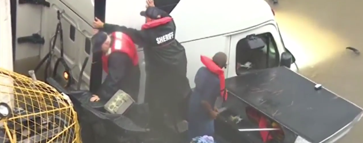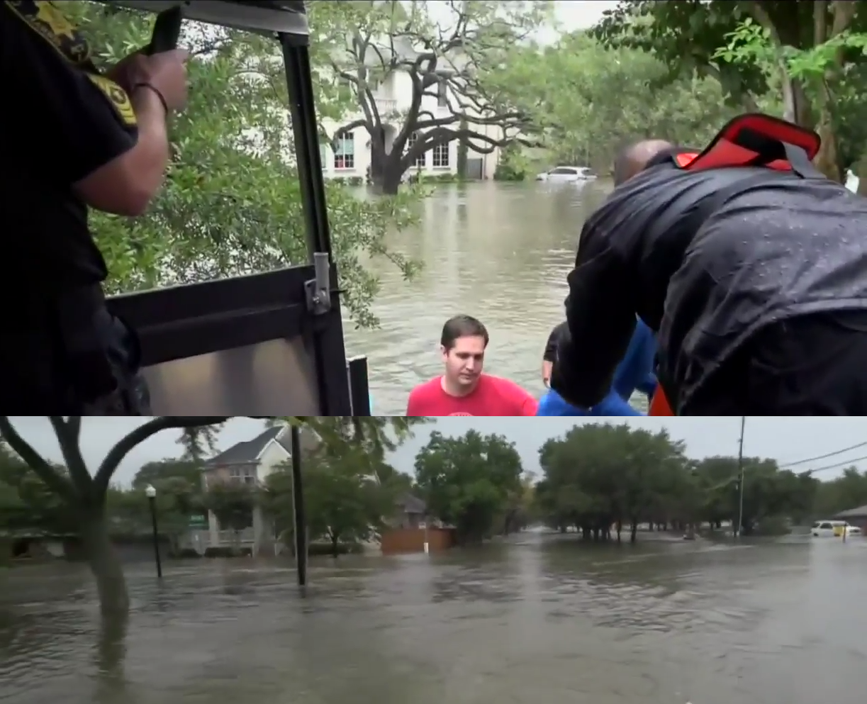 תמונות מלפני זמן קצר מבלייר, טקסס, מיוסטון, טקסס, ומביצוע חילוץ לכודים ברחוב מוצף ביוסטון, בהתאמה. באותו רחוב עדיין לכודים ילדים ותושבים נוספים, שיקבלו חילוץ מסודר בקרוב.