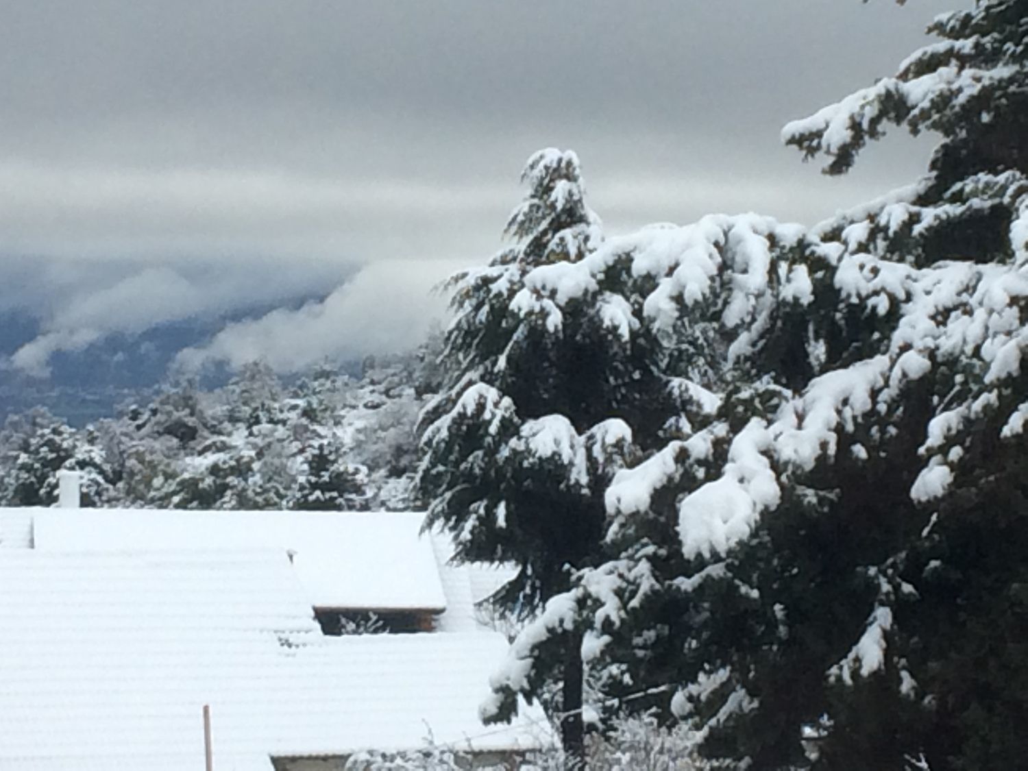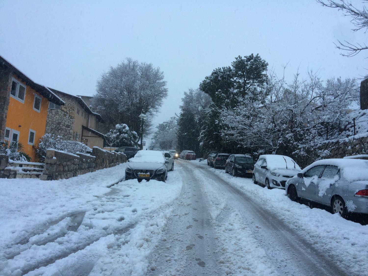 - לפני רגע היו פתיתי שלג קטנים בבית אורן כעת התגבר לגמבש עדיין חלש מכדי להערם על מכוניות ירדן