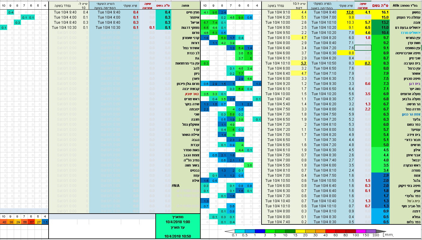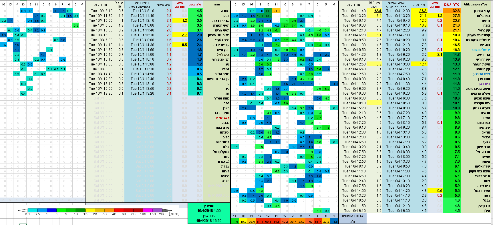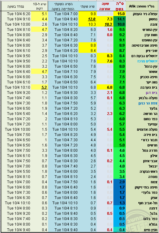 קרני שומרון בראש גם מבחינת הכמות בכללי (32). וגם בכמות השעתית (27).ו 10 דקתית. (12 מ"מ).