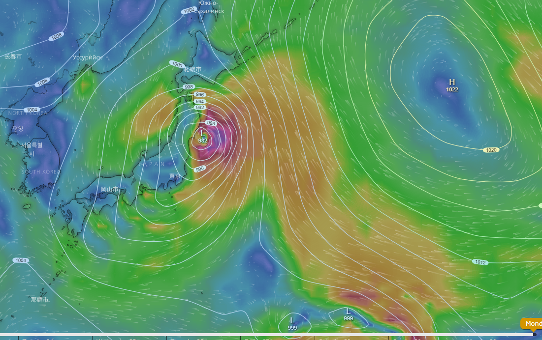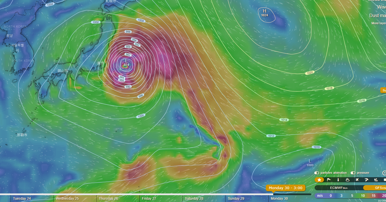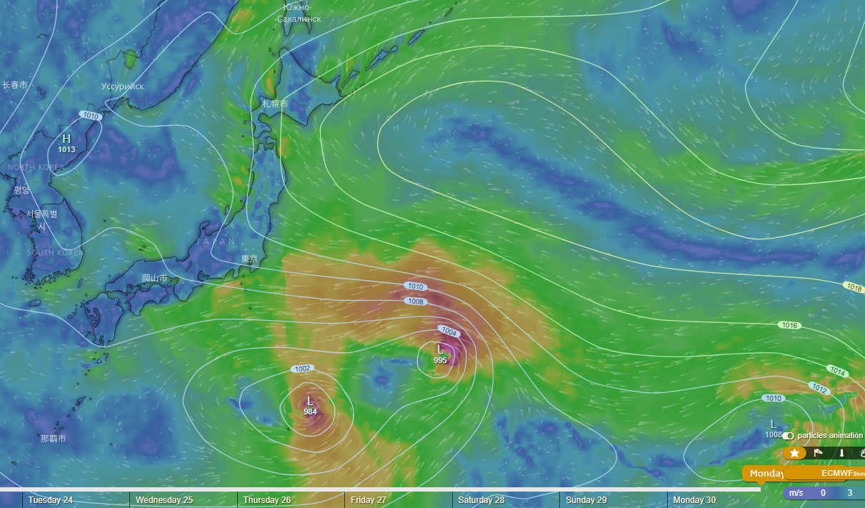 באוקיינוס השקט לכיוון צפון מזרח ובתחילת שבוע הבא היא צפויה לנוע לכיוון צפון מערב-צפון צפון מערב לכיוון חופיה המזרחיים של יפן (טוקיו וצפונה).