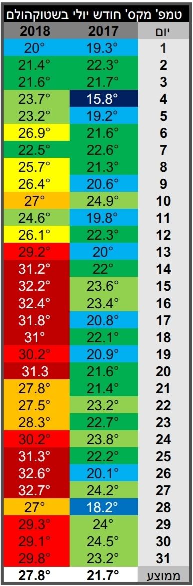 בשביל לראות עד כמה יולי היה חם השנה באזורים אלו, אספתי וקיבצתי בשתי טבלאות את נתוני טמפ' המקסימום שנמדדו לכל אורך החודש בלונדון ובשטוקהולם.