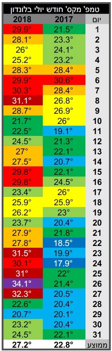 בלונדון ירדו בחודשים יוני-יולי 36.4 מ"מ בלבד, לעומת 296 מ"מ שירדו בתקופה המקבילה אשתקד (יוני-יולי 2017).