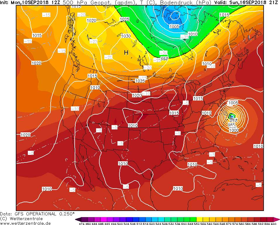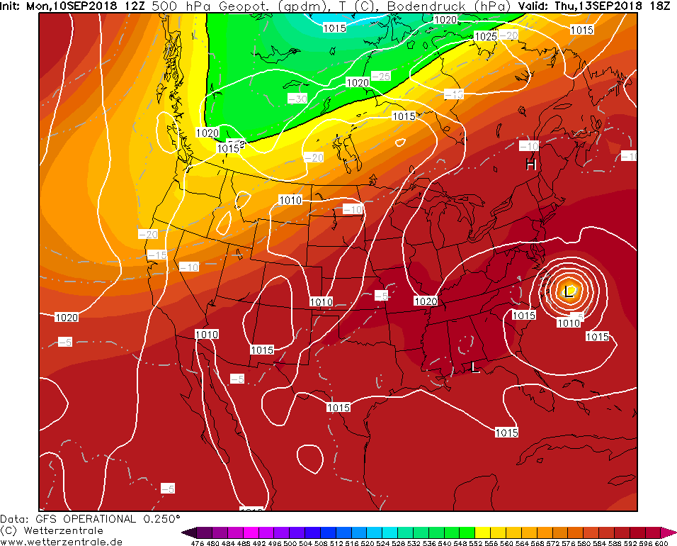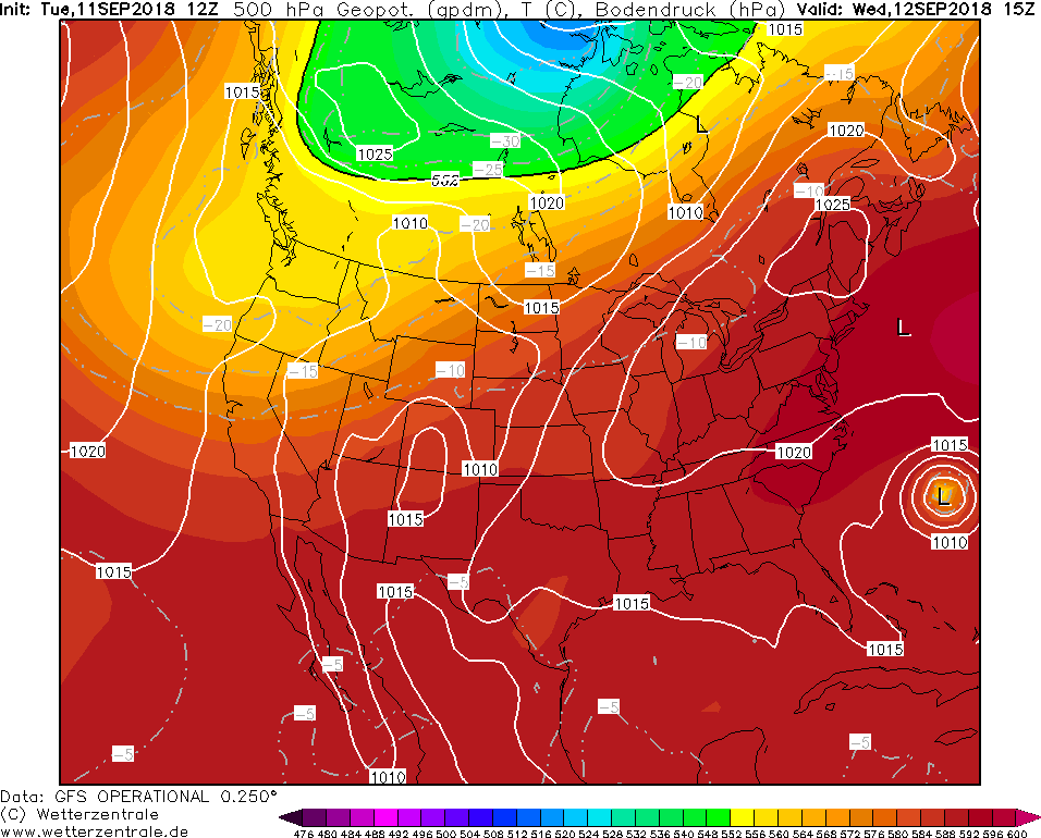 - מפת 500 מ.ב לעוד 27 שעות , שימו לאוויר החם (באדום ) שיושב ממש מול דרום וצפון קרוליינה . בצי