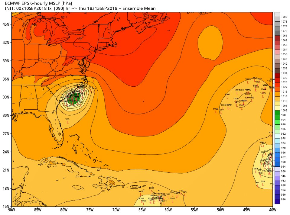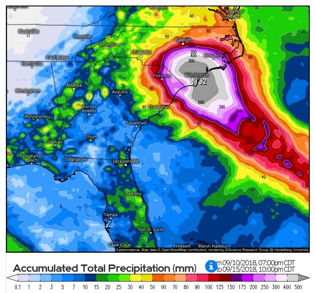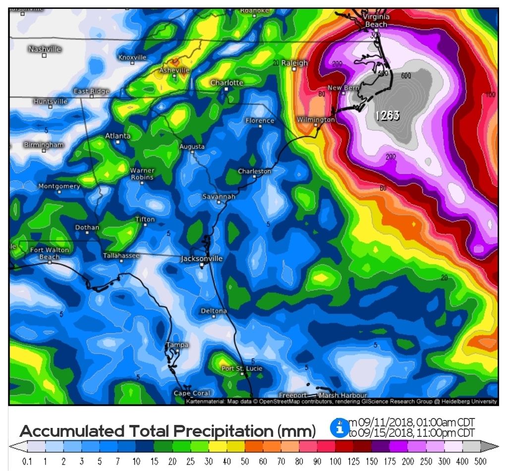 איסי קיצוני יותר (מקסימום 1,132 מ"מ) עם כמויות אדירות של גשמים, כמויות שיכולות לעבור את ה-1,000 מ"מ באזורים מסוימים בחופי צפון קרוליינה בימים הקרובים.