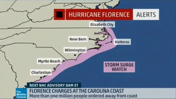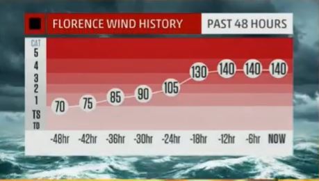 במלוא הדרה, הסופה פלורנס הופכת רשמית להוריקן בקטגוריה 4 (דרגה אחת לפני החזקה ביותר). עוצמת הרוחות בקטגוריה זו יכולה להגיע בין 209–251 קמ"ש. הוא עושה את דרכו במהירות לחופי קרוליינה וממשיך לצבור תאוצה לקראת פגיעה אפשרית ביבשה.