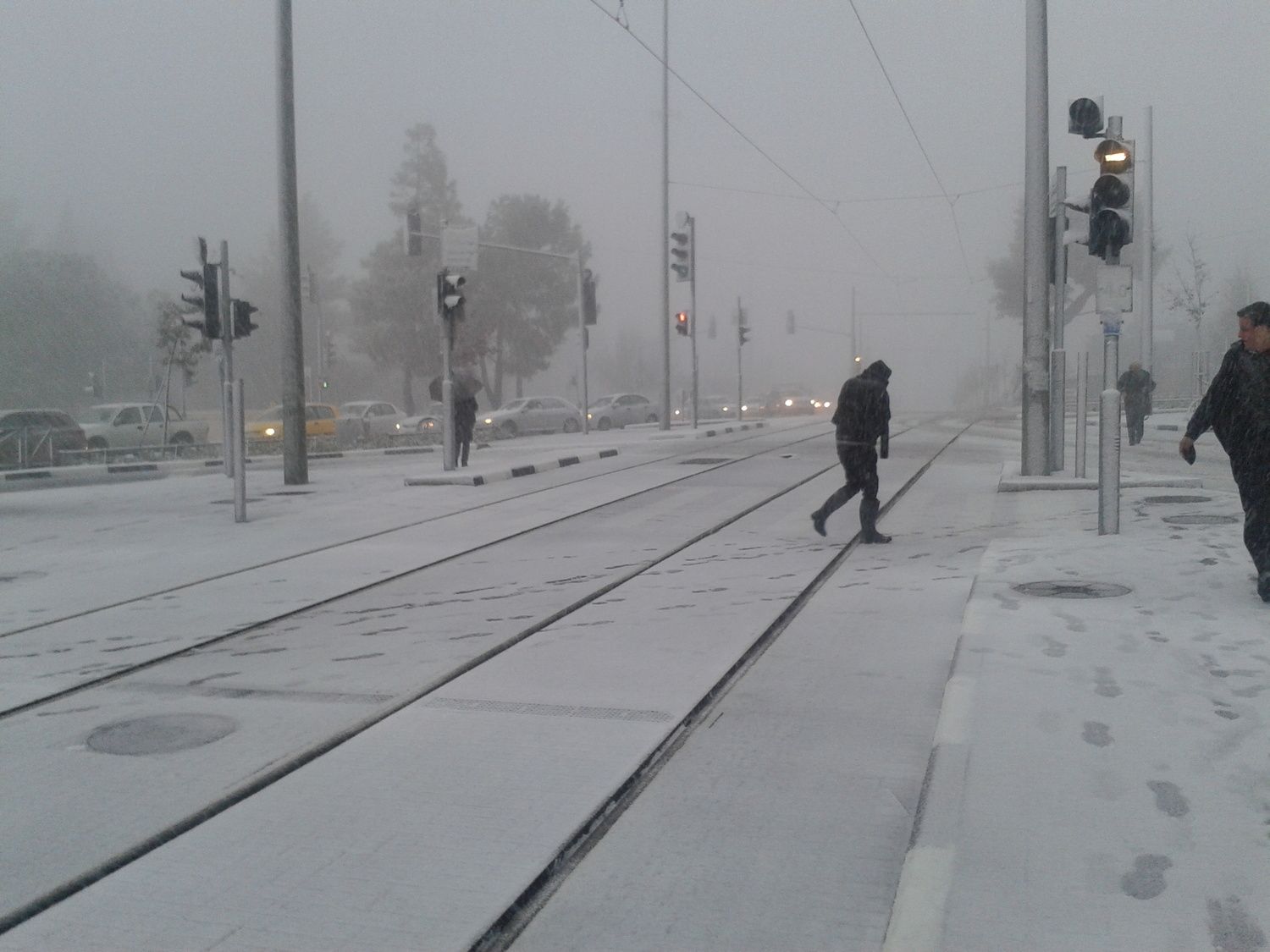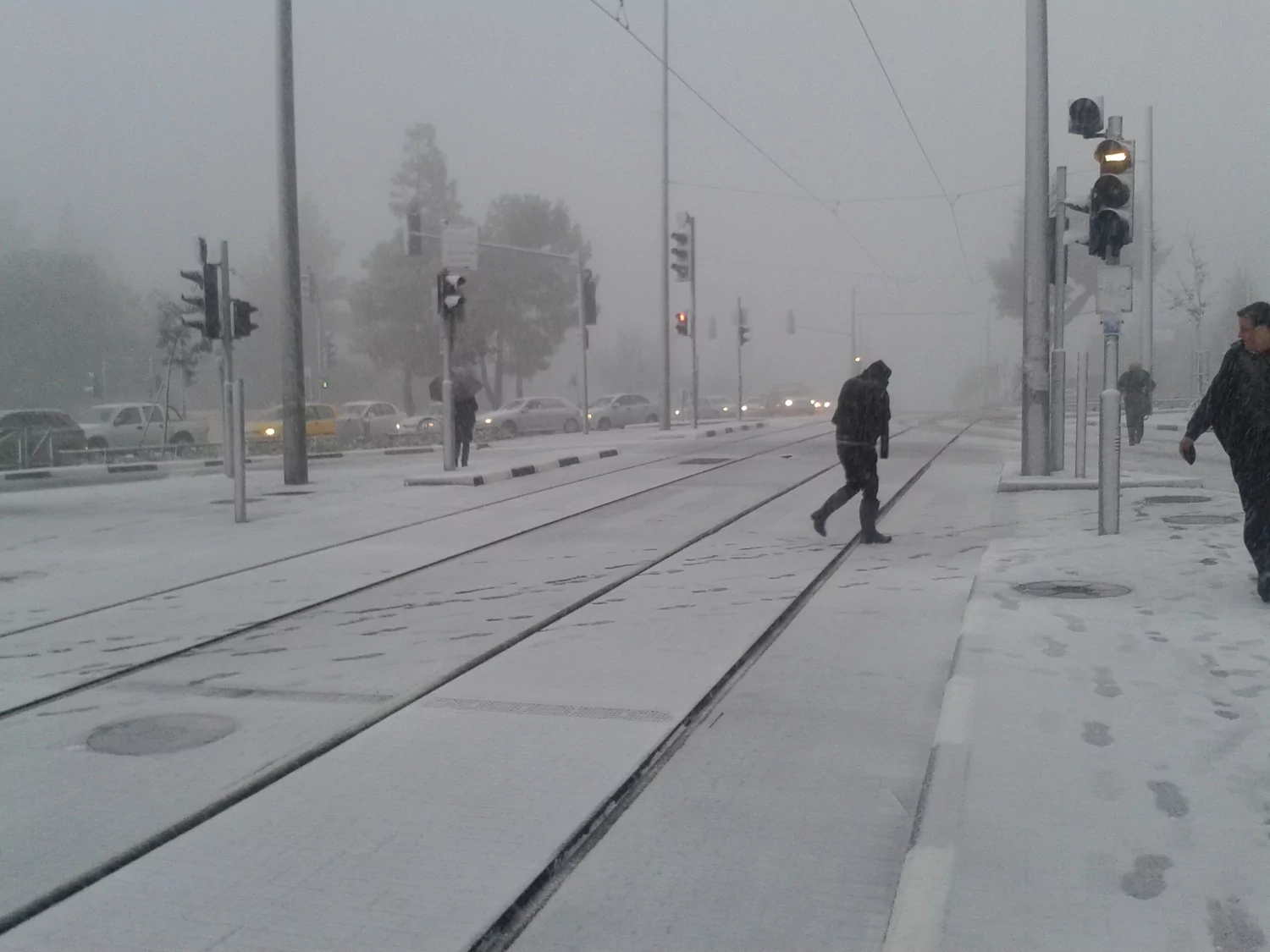 - השלג בבוקר הראשון של הסערה, במסילת הרכבת הקלה בהר הרצל אליחי