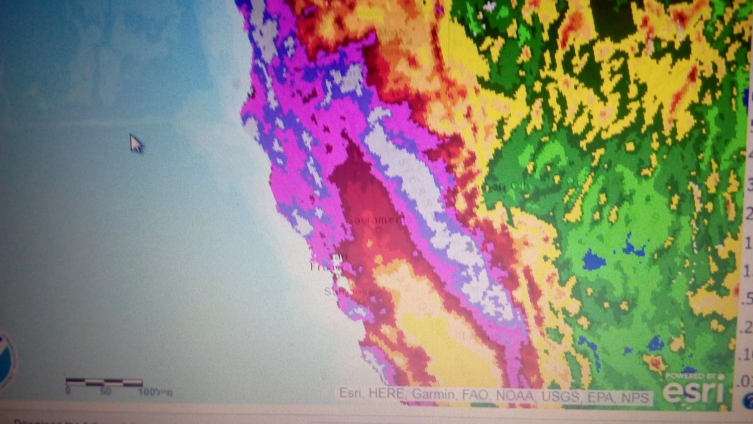 האזור הלבנבן פרושו מעל 500 ממ משקעים שפרושם בצד הימני של הצילום שהוא רכס הרי סיירה נבדה מעל 5 מ' שלג