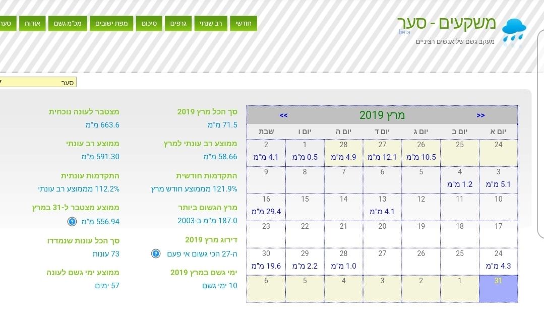 הגשם בצפון הארץ שבר שיא לחודש מרץ והגיע עד 25 ימים וכנ"ל גם מספר ימי השלג בהרים - 8 ימי שלג בהר כנען ו-6 ימי שלג בירושלים (!)