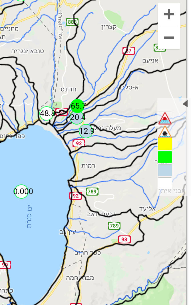 - הספיקות בשיא קרוב 70 קוב בשנייה במשושים,מעכשיו עד לרגיעה עלייה של ס"מ כל שעתיים לכנרת דוד
