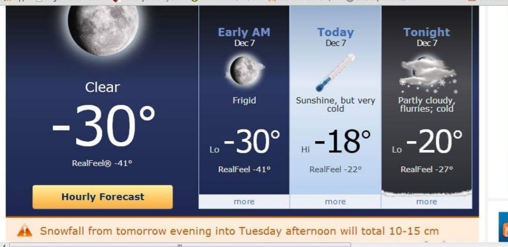 18-19 מעלות מתחת לאפס בשעות הצהריים (תחושה של מינוס 27-28) וגם ירד שלג אבקתי ויבש מאוד בעל פתיתים זעירים וקטנים במיוחד (שלג שיורד רק בטמפ' נמוכות מאוד), עם לבוש תרמי ושכבות זה היה די נסבל להיות בחוץ, למרות שהקור ממש צורב.