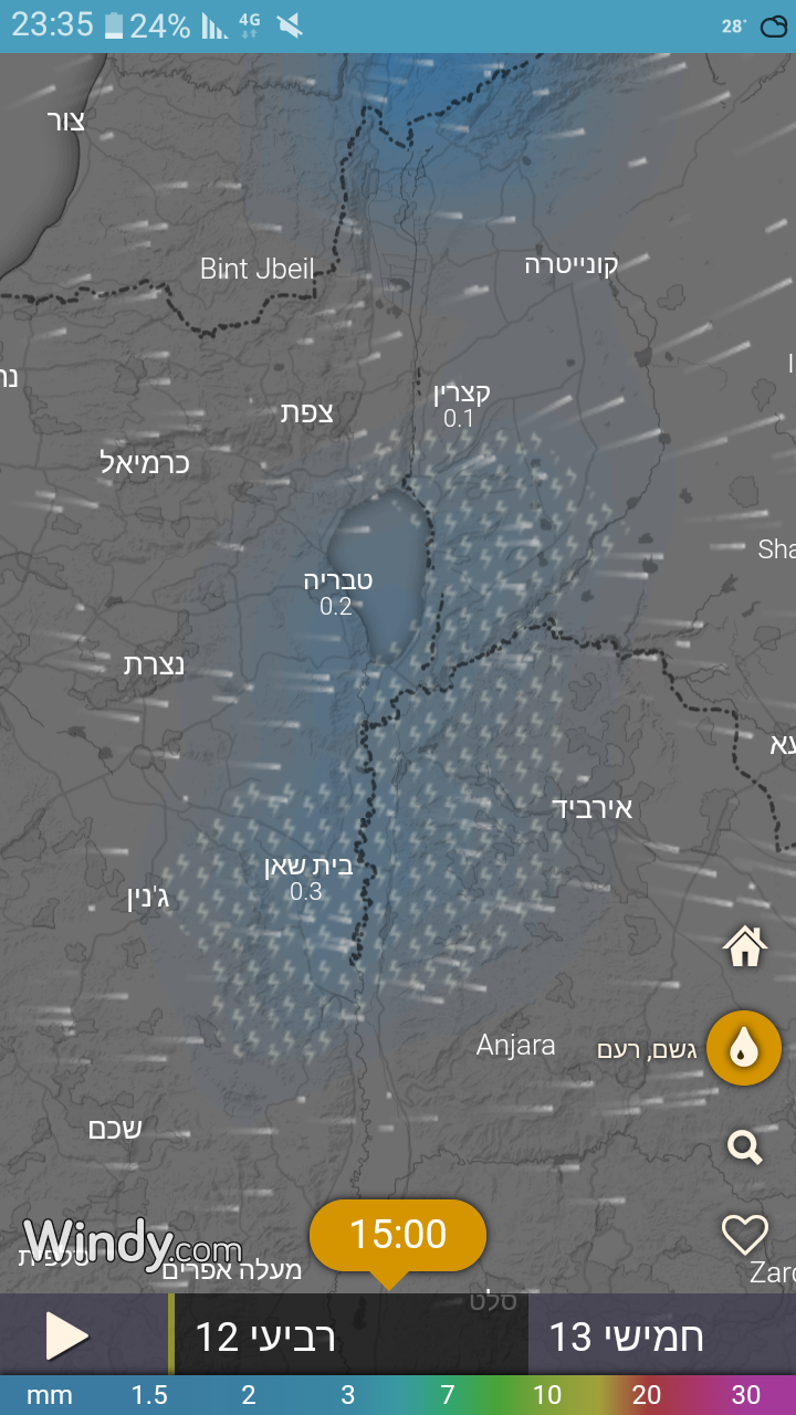 - כרגע Windy מראה סיכוי לסופות רעמים במזרח הכנרת ביום רביעי אדיר