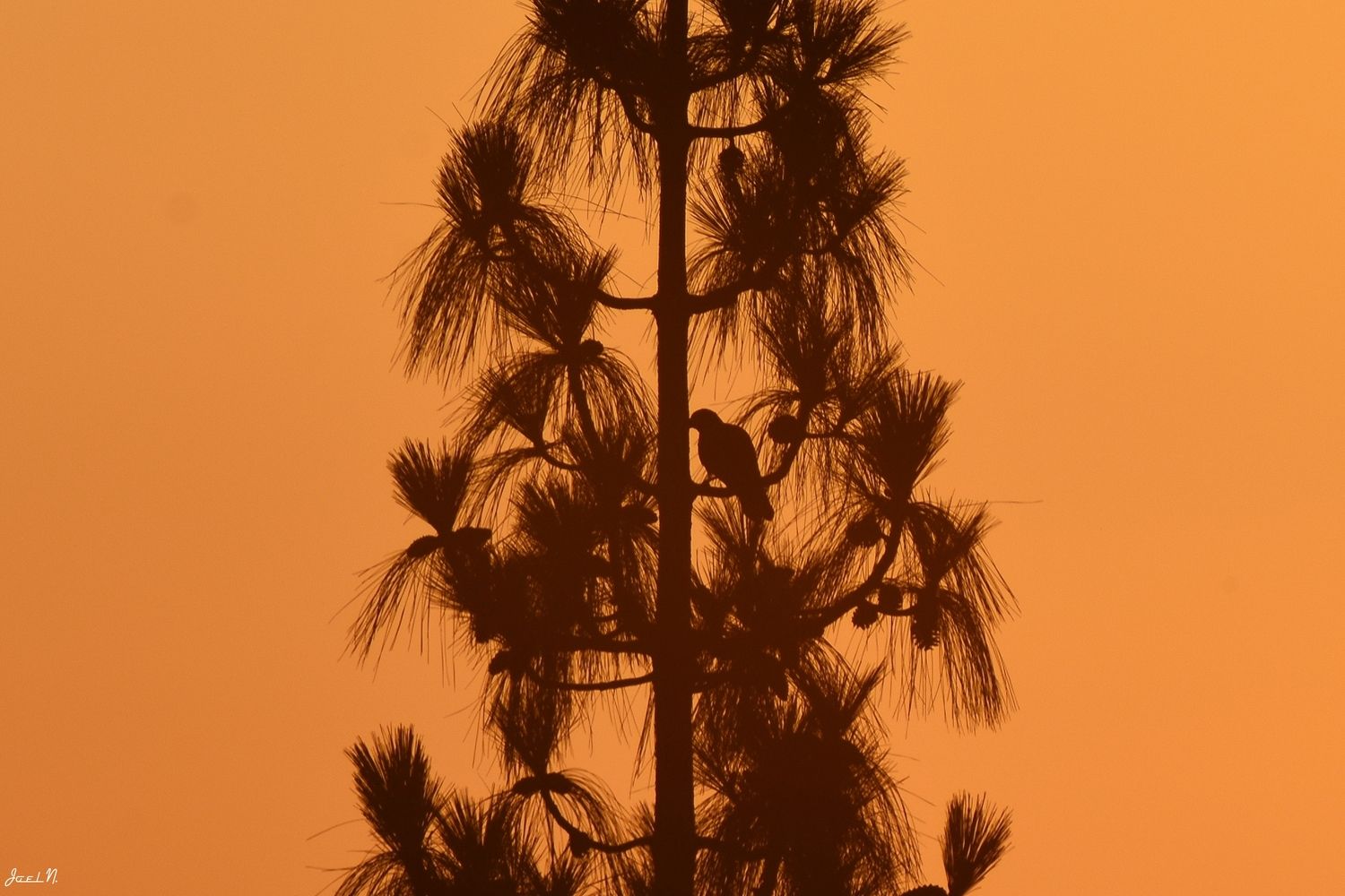 צללית של עץ אורן עם יונה על רקע שמיים כתומים של שקיעה