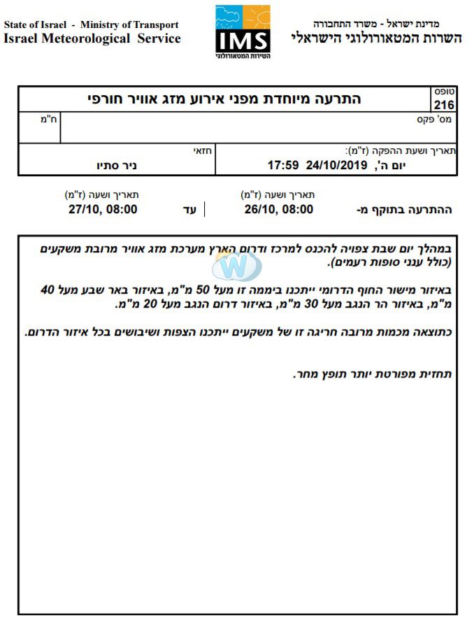 - [!] התרעה מיוחדת מפני מזג אוויר חורפי - השירות המטאורולוגי Weather2day