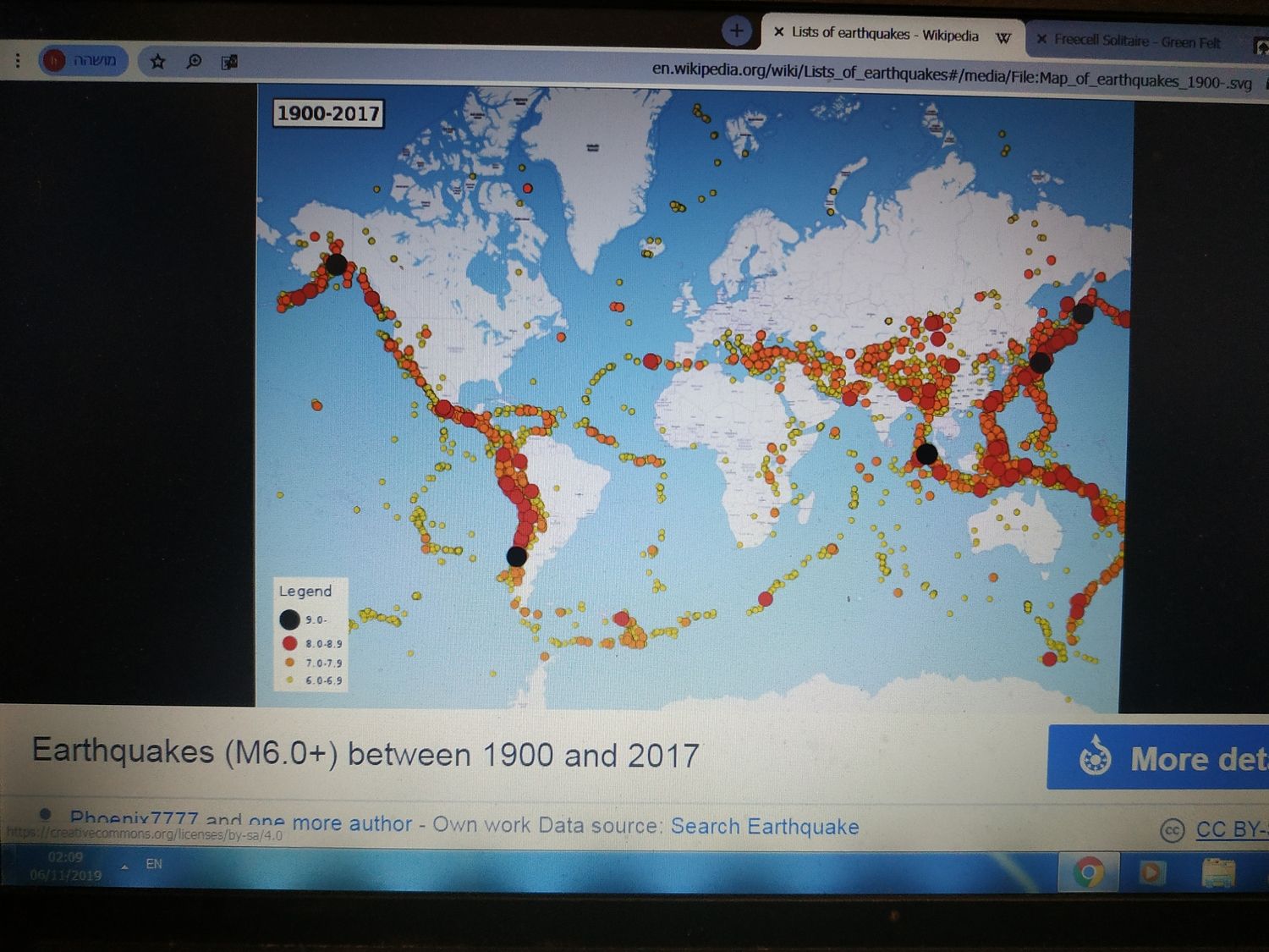 - מפת רעידות מעל עוצמה 6 מאז 1900 בעולם חנוך א