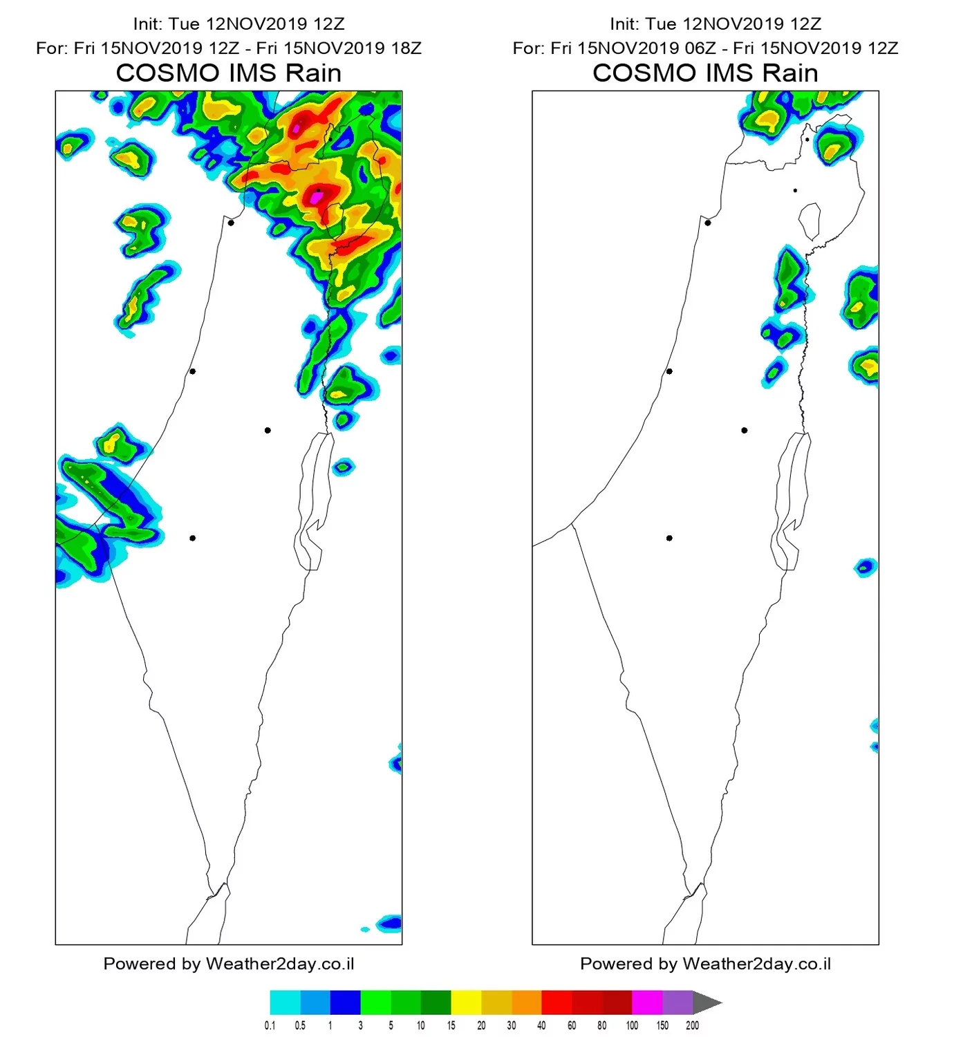מודל קוסמו צופה גשמים פזורים/ממטרים מלווים בסופות רעמים משעות הבוקר של יום שישי בחלקים פנימיים של מזרח הארץ וצפונה. הפעילות הזו תימשך ככל הנראה גם בלילה עם גשמים שיכולים להופיע מהנגב וצפונה, ברקים וסופות רעמים עדיין בתפריט. לא פעילות מסודרת ולכן יש לעקוב ולהתעדכן.
