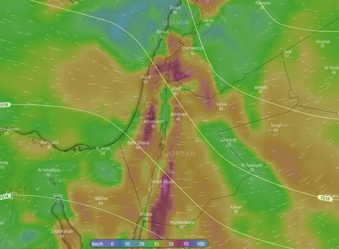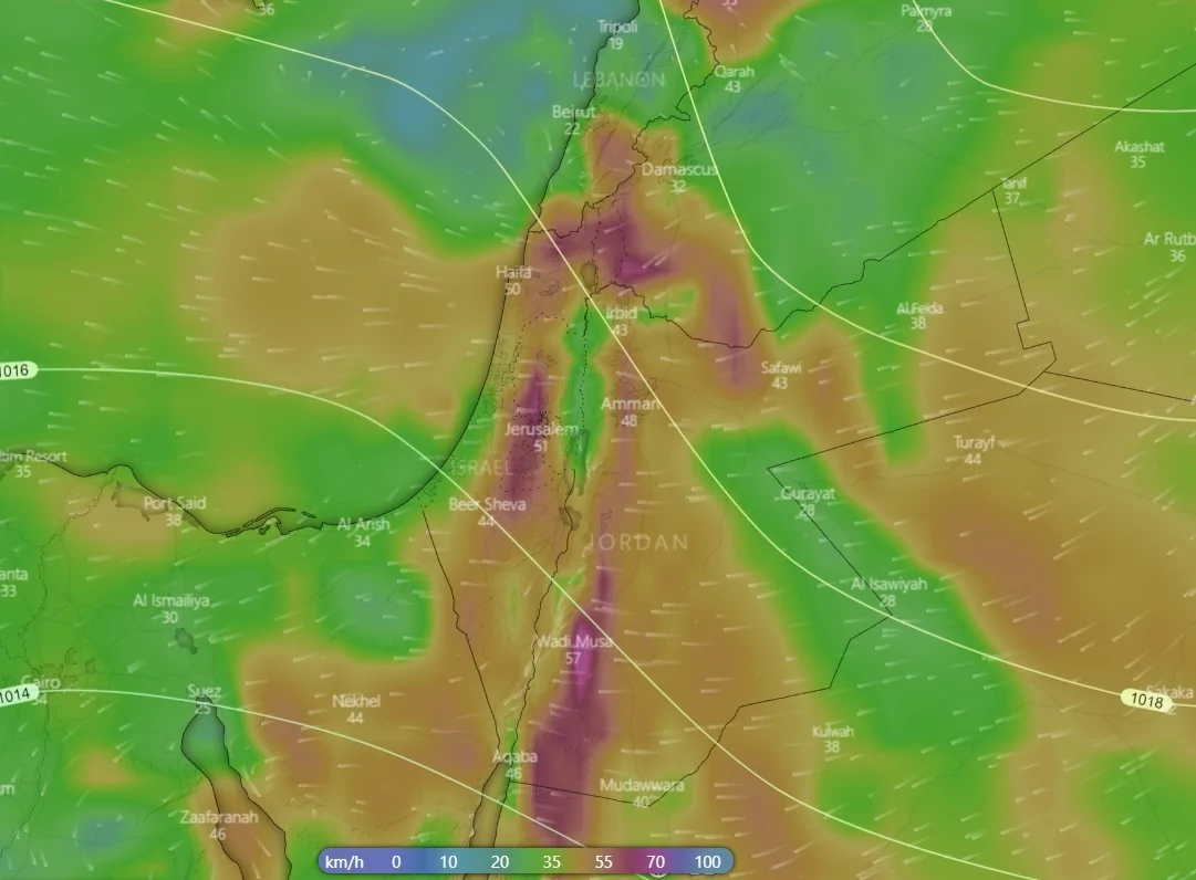 ההרים בהם החיכוך יורד יזכו למשבי הרוח החזקים ביותר - סביב 70 קמ"ש, יתר האיזורים יסתפקו ב-50 קמ"ש.