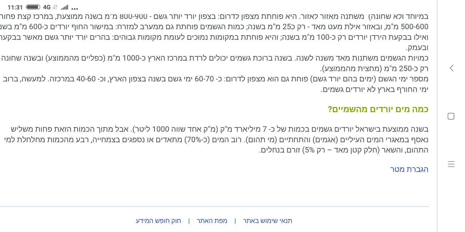 יעני אם כל הגשם יורד רק בחצי המדינה אז ממוצע הגשם בארץ הוא 700 מ"מ לשנה שזה הגיוני כי רוב המדינה מקבלת כ- 500-550 מ''מ ואילו הצפון מקבל עד 1000 מ''מ ואזור באר שבע מקבל 200 מ''מ לשנה.