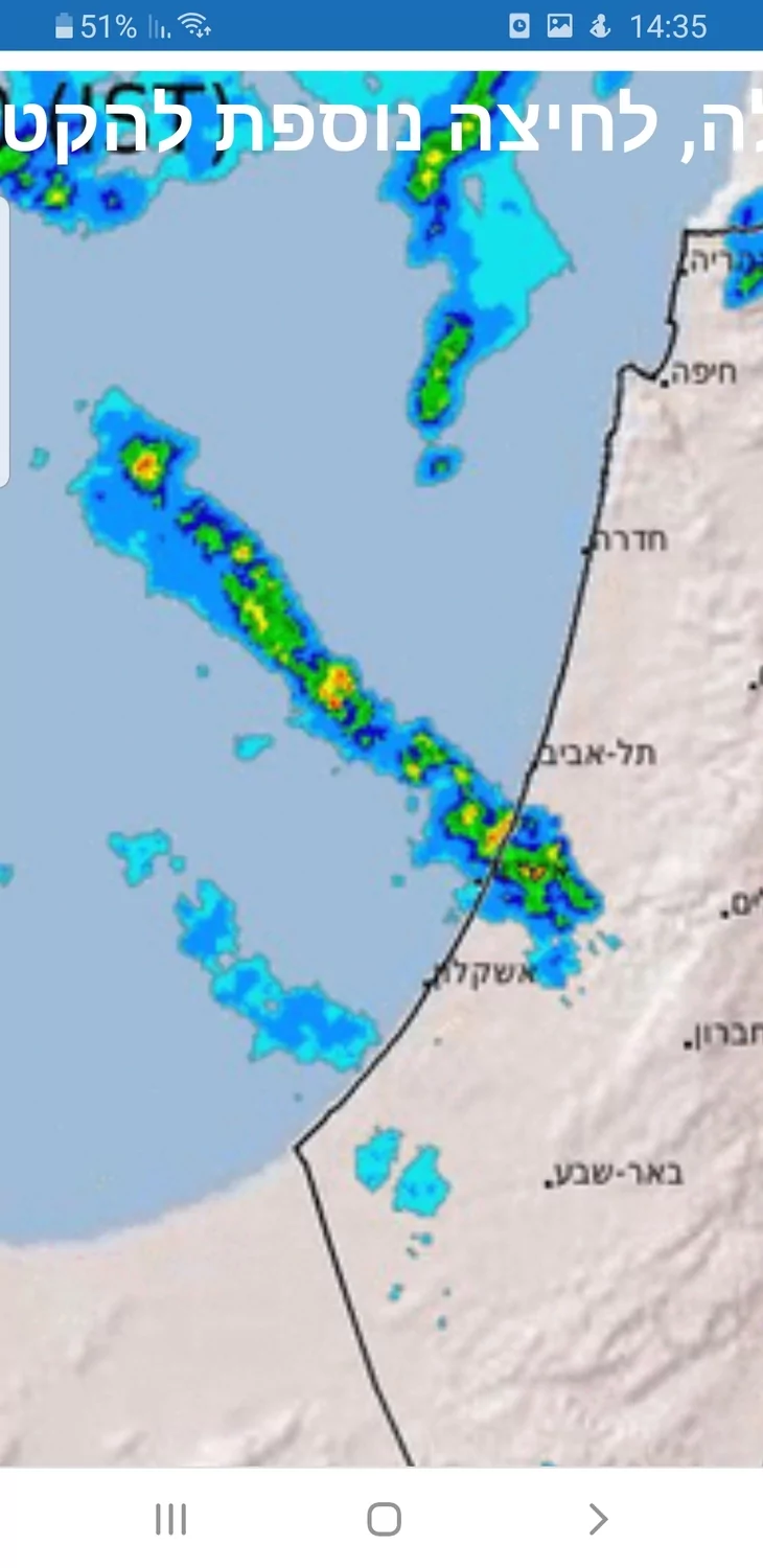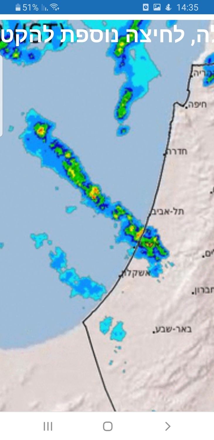 אני עוקב אחריה בשעה האחרונה ורואה שהיא זזה צפונה לאורך החוף מאשדוד ,קרגע היא בין חדרה לזיכרון...האם אחריה תהיה הפוגה? כלומר מי שהזית חלפה אותו מה מצב מזג האוויר אצלו קרגע]נגיד תא?
