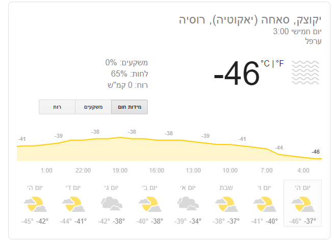 - אלרום לע: 7 בבוקר - מינוס 5 מעלות, 9 בבוקר - פלוס 7 חנוך א