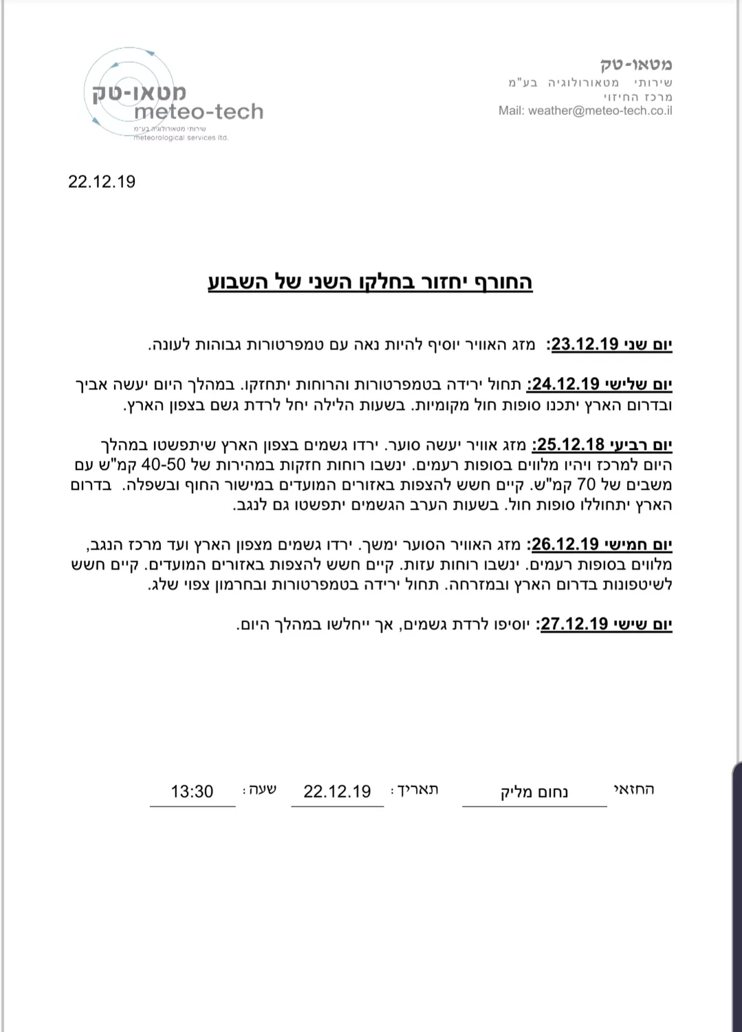 - דיווחי מזג אוויר - יום ראשון 22/12/2019 חנוך א