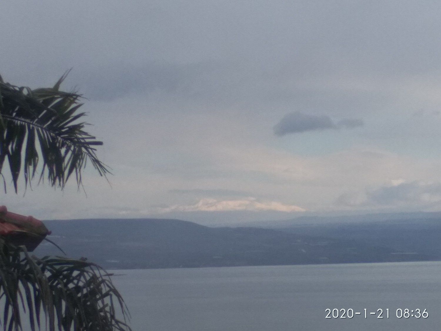 שואל כדי לראות את הגולן המושלג מטבריה ברקע הכנרת