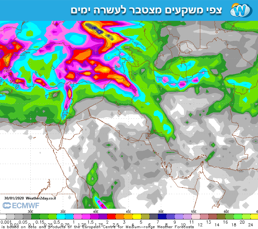 - צפי משקעים מצטבר ממודל ECMWF עדכון ערב 12Z Weather2day
