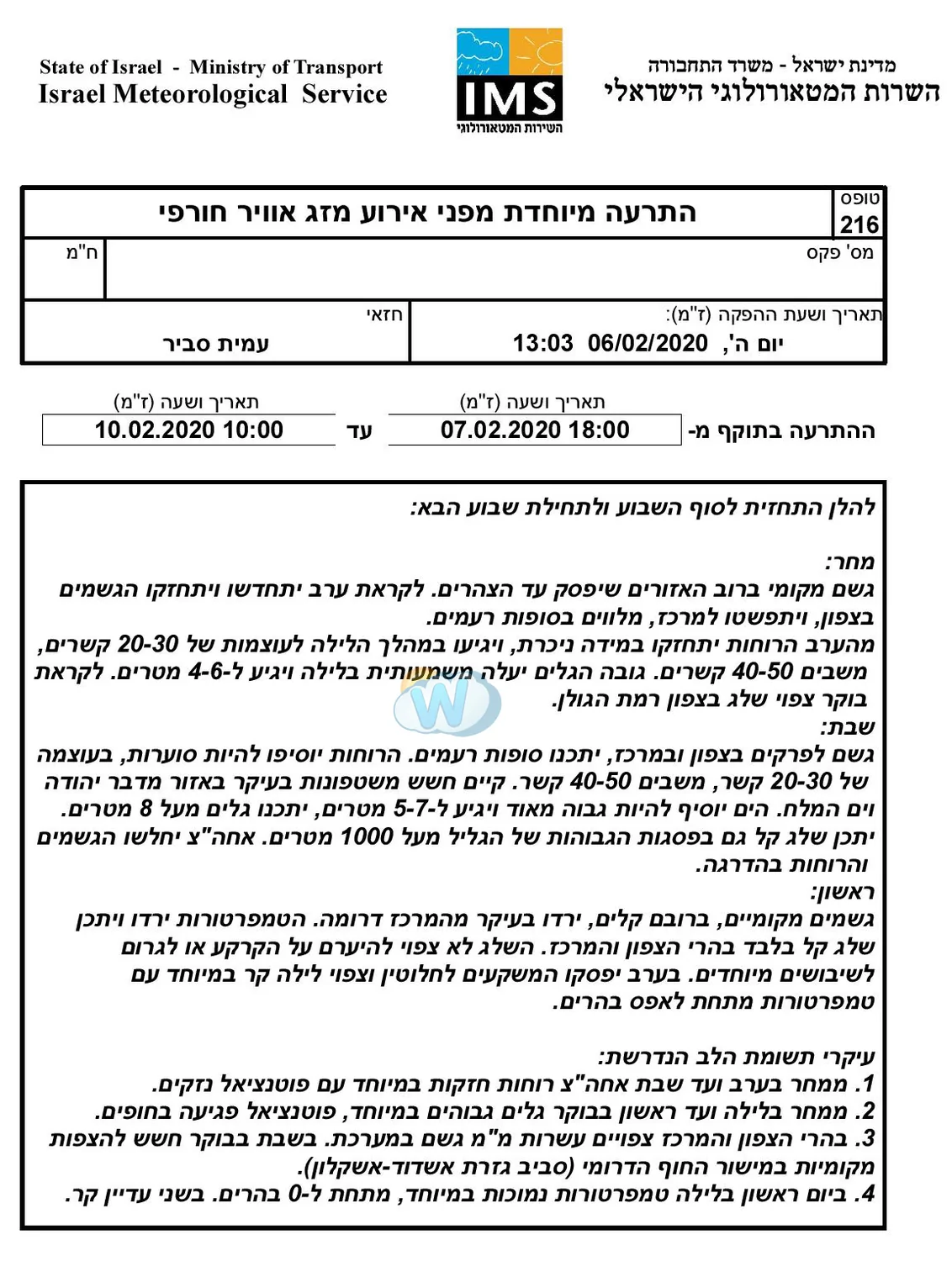 - השירות המטאורולוגי: התרעה מיוחדת מפני אירוע מזג אוויר חורפי Weather2day