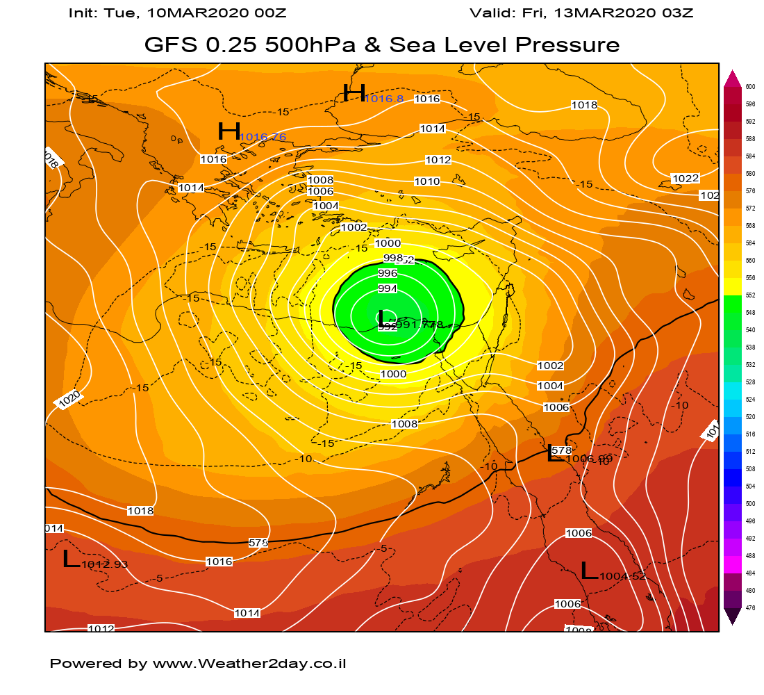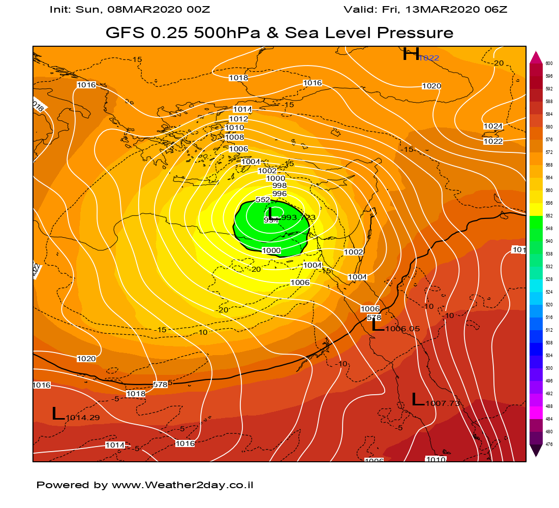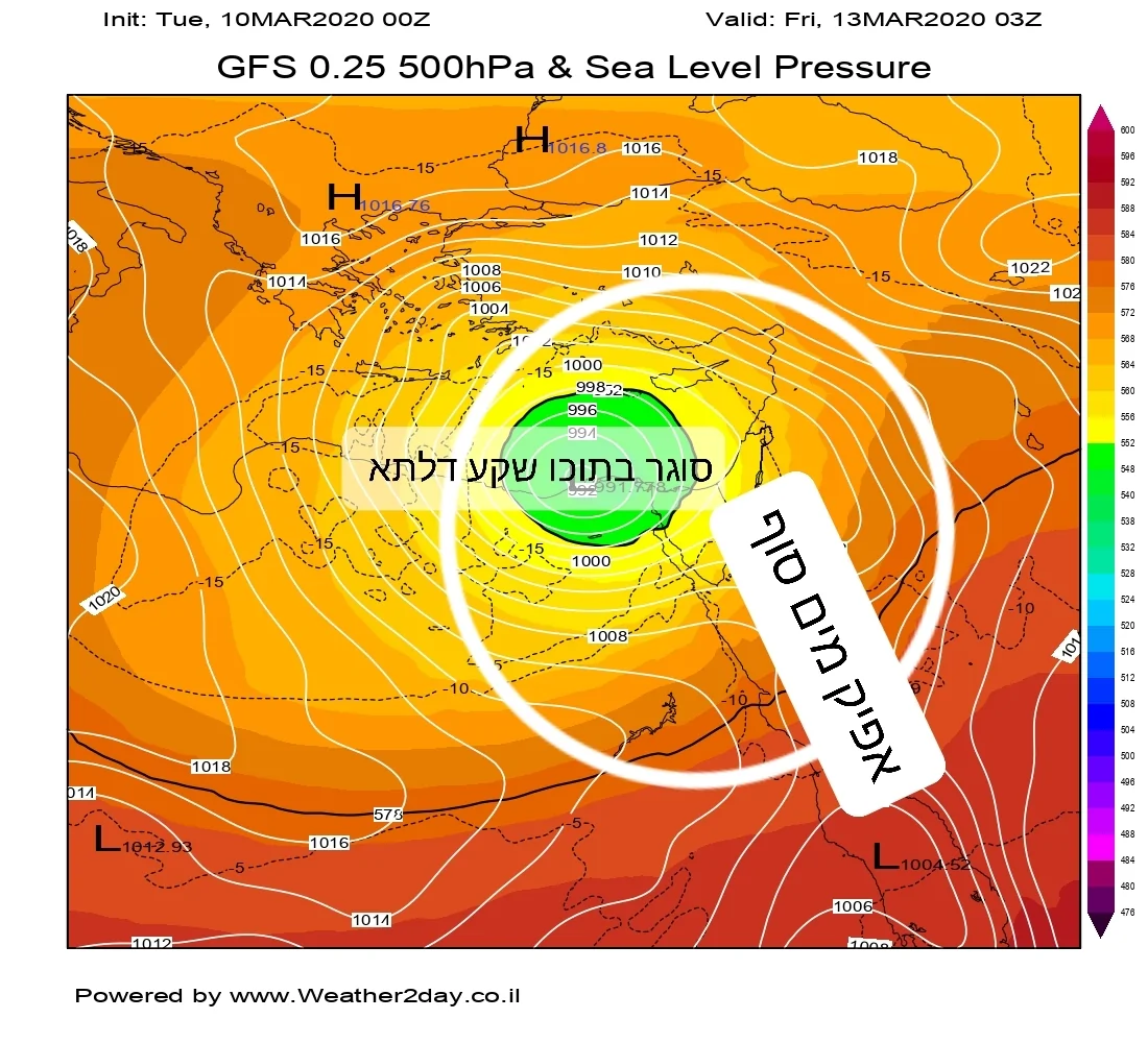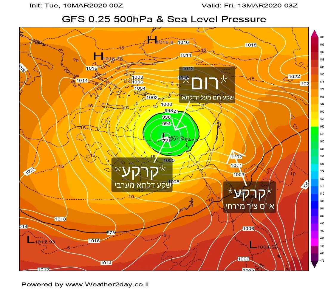 ברום: שקע עמוק במיוחד! עד 540 דאם. יגרום לחיתוך רוח עז בקרבת מפרץ סואץ ולפעילות אנרגטית מאוד. יסייע להסעת מאסות לחות מעלה ויצירת תאי סופה אלימים למדי.