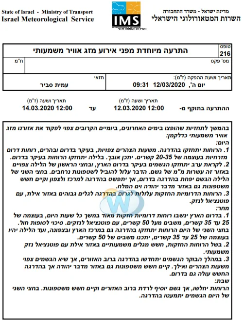 - השירות המטאורולוגי: התרעה מיוחדת מפני אירוע מזג אוויר משמעותי Weather2day