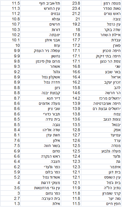 - מצפה רמון - 41.4, עבדת - 28.5, נאות סמדר - 26.2, שדה בוקר - 23.2 חנוך א