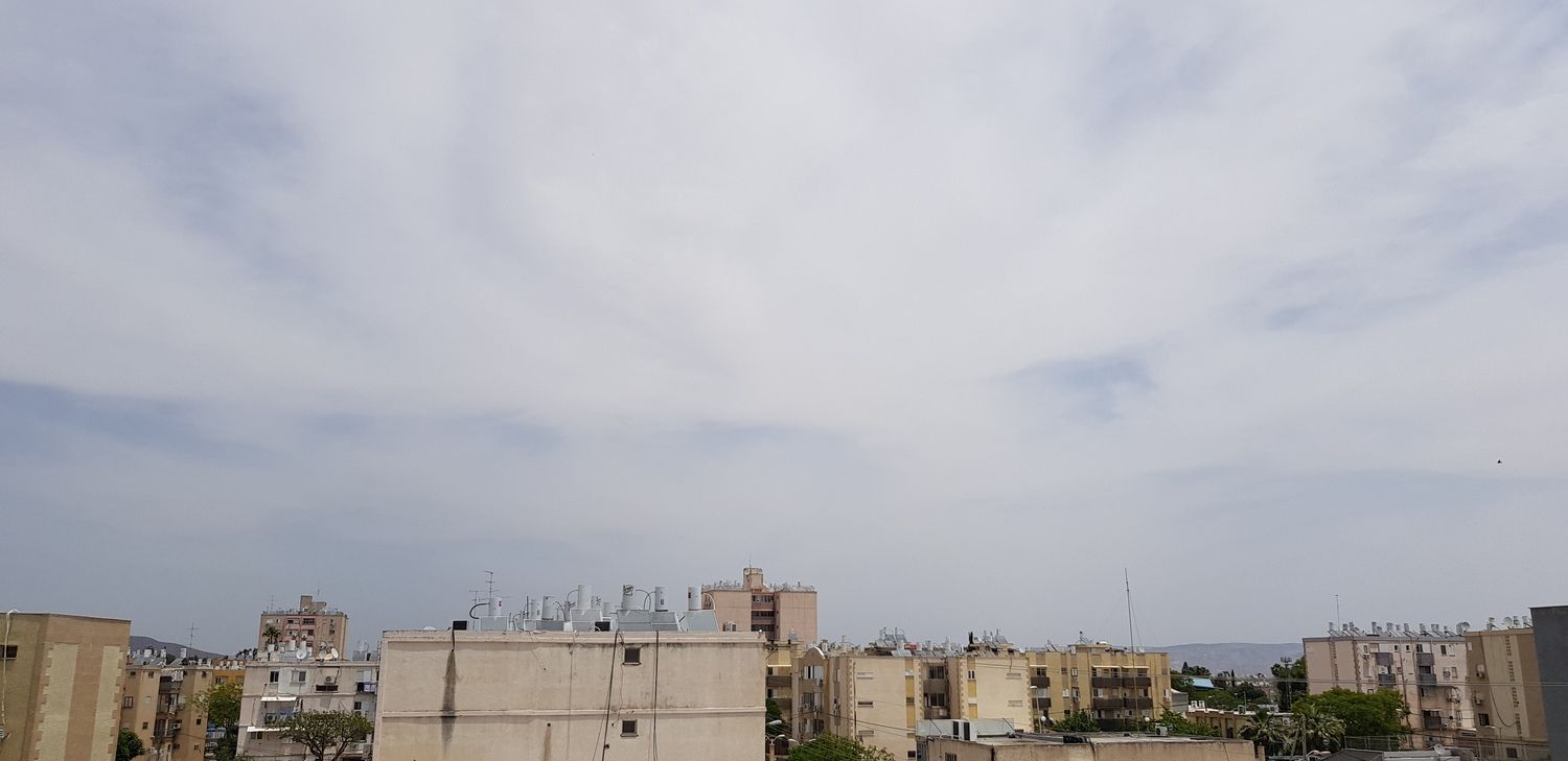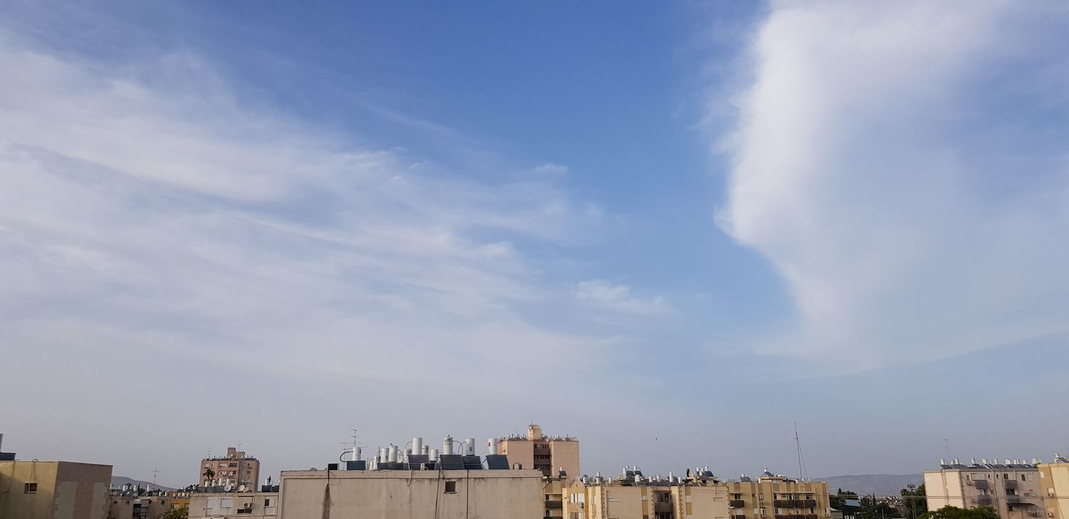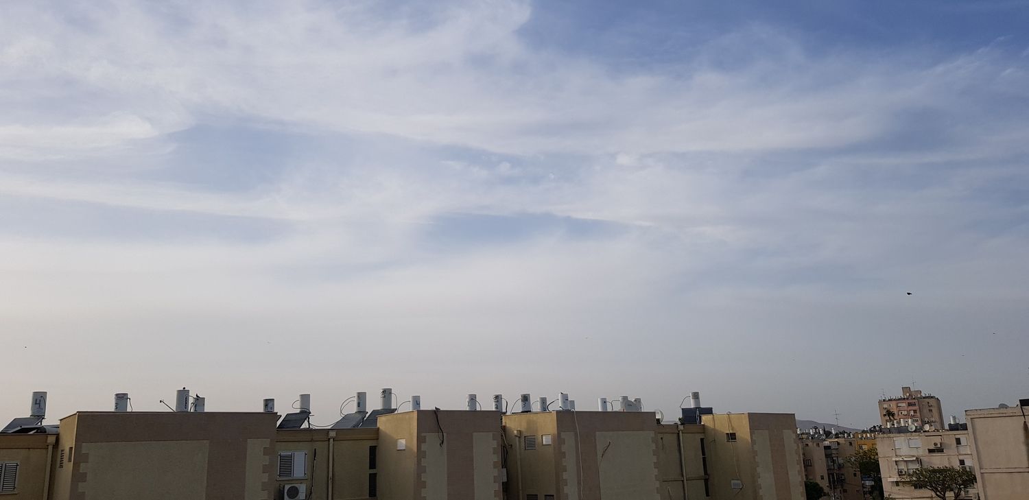 אותם עננים שהשבוע ציינתם את שמם - צירוסטרטוס. כעת, לראשונה העונה, הגענו פה ל-30° אך בינתיים הבריזה הימית מצליחה עדיין להשפיע והחום נסבל לגמרי. כעת 30° עם 46% לחות, עומס חום כבד