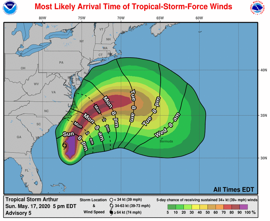 הסופה הטרופית Arthur משפיעה כעת על הקצה המזרחי של צפון קרוליינה וגורמת שם למזג אוויר סוער. מחר היא תתרחק ותמשיך להיות סופה טרופית לעוד כמה ימים.