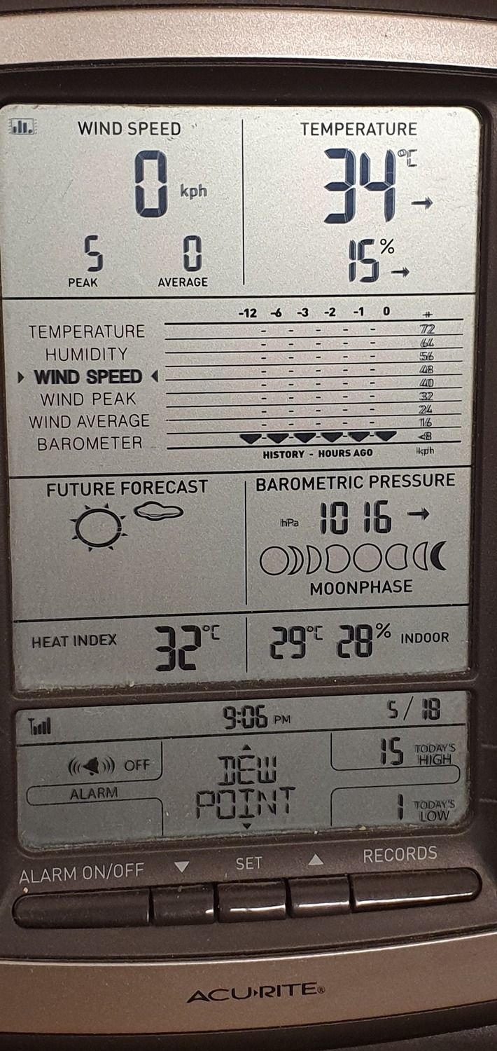 בימים האחרונים כל ערב בשעה הזאת הטמפרטורה יורדת לאיזור ה30-31 מע', ואז בערך ב23:00 הטמפרטורה עולה לאיזור ה33-34 ונשארת ככה להמשך הלילה.