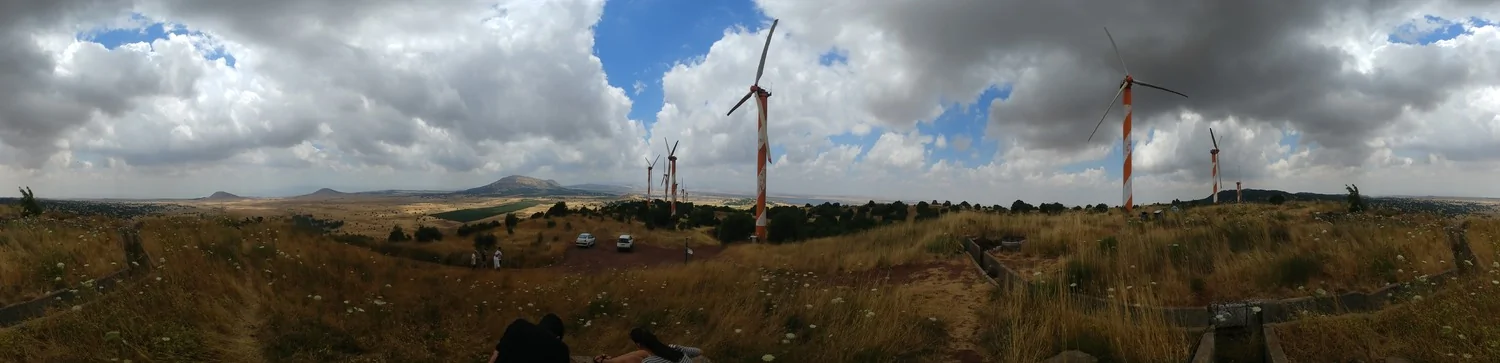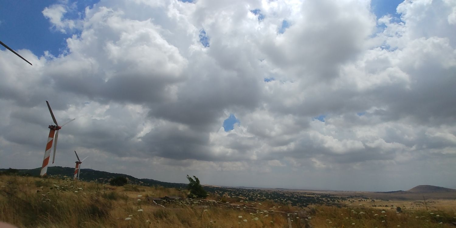 אני עכשיו בחוות הטורבינות וממש קר פה, יש פה רוח קרה עזה ממש, מצרף פנורמה שצילמתי ממש עכשיו. השמים מכוסים ממש בקומולוסים תפוחים ומפותחים