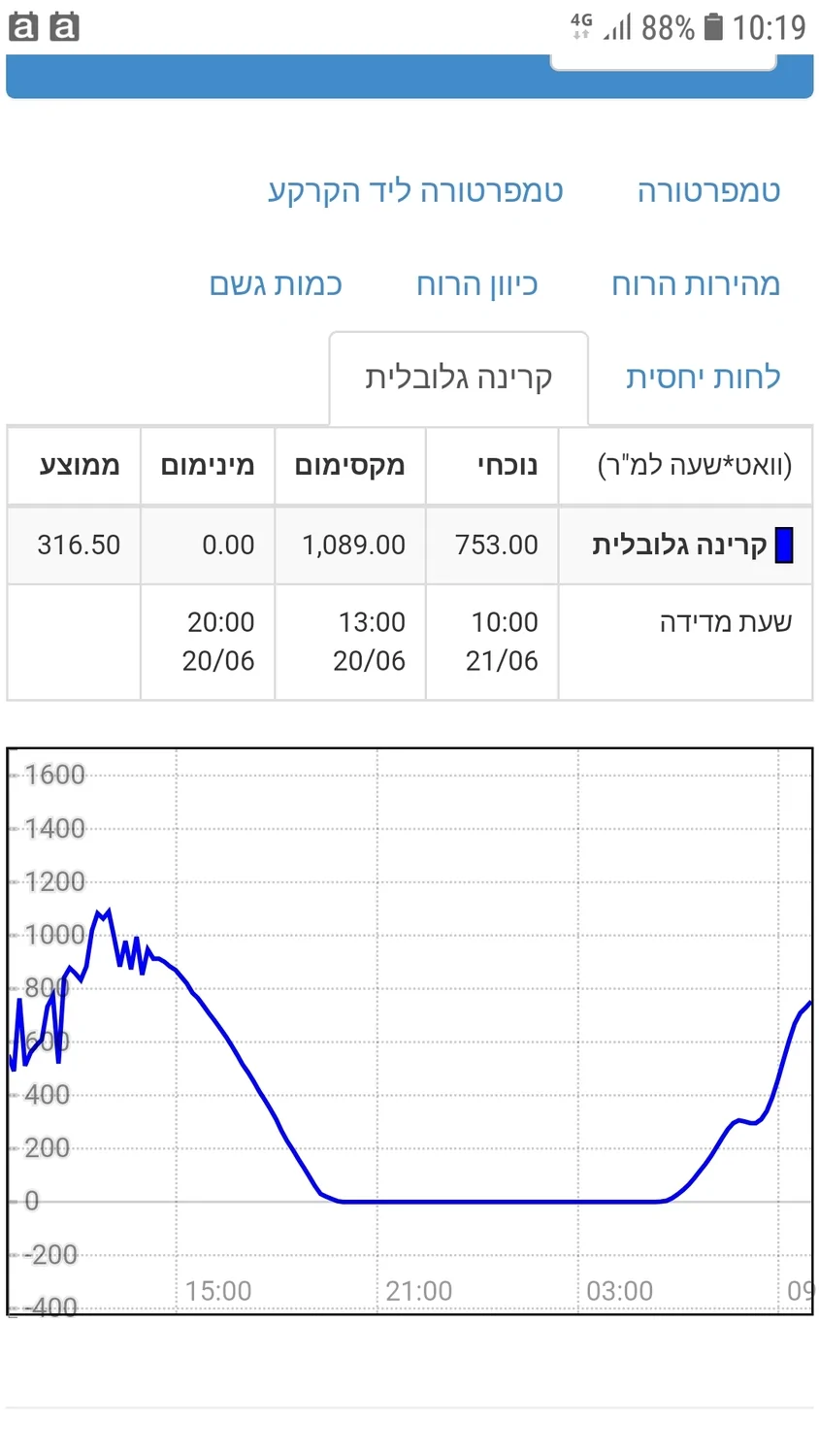 ההפרש בין העקומות עבר את ה- 200 וואט למטר מרובע לקראת השעה 08:30.
