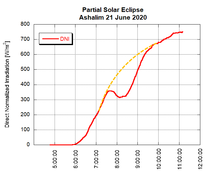 העקומה האדומה מציגה את ערכי קרינת השמש הישירה, כפי שנמדדה היום באשלים, לעומת מה שהיה אמור להימדד לולא הליקוי (קו מקווקוו בצבע כתום).