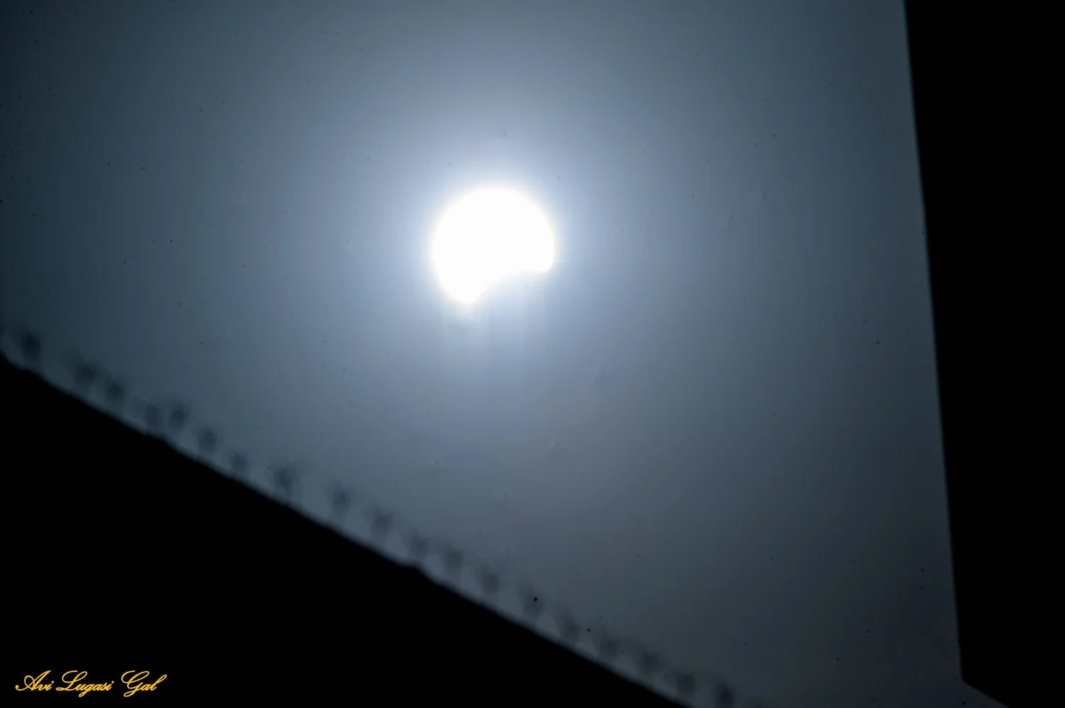 תמונה ראשונה מהשיא. בתמונה השניה נדהמתי לגלות שתפסתי את כל דיסקת הירח החשוכה בשלמותה בעודה מכסה חלקית את דיסקת השמש, כחצי שעה לאחר חלוף שיא הליקוי