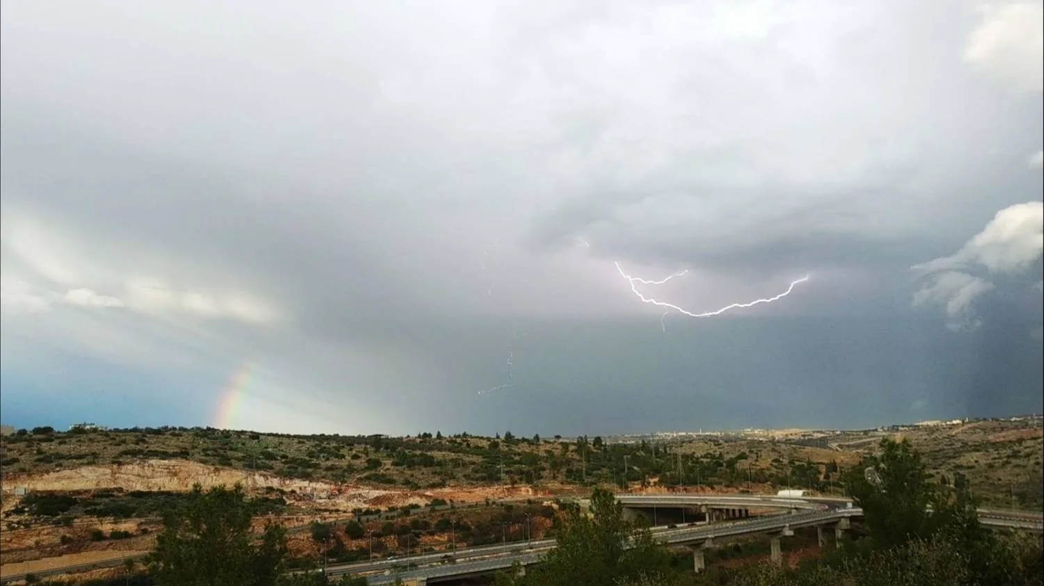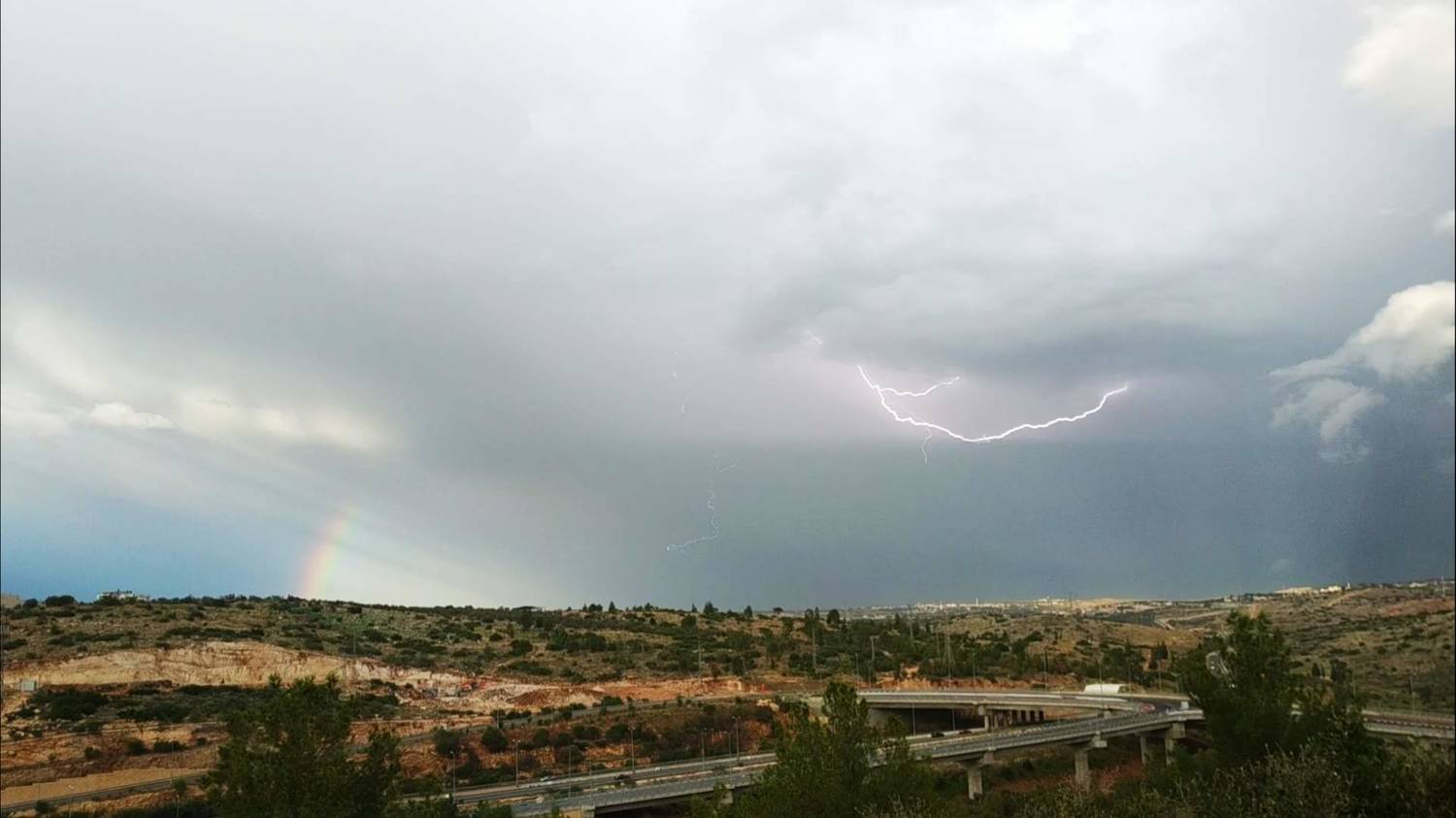 ברק, קשת בענן ומסכי גשם, כפי שנצפו מהנקודה הגבוהה ביותר ביער לכיוון השומרון בערב שישי ה-23.11.2018: