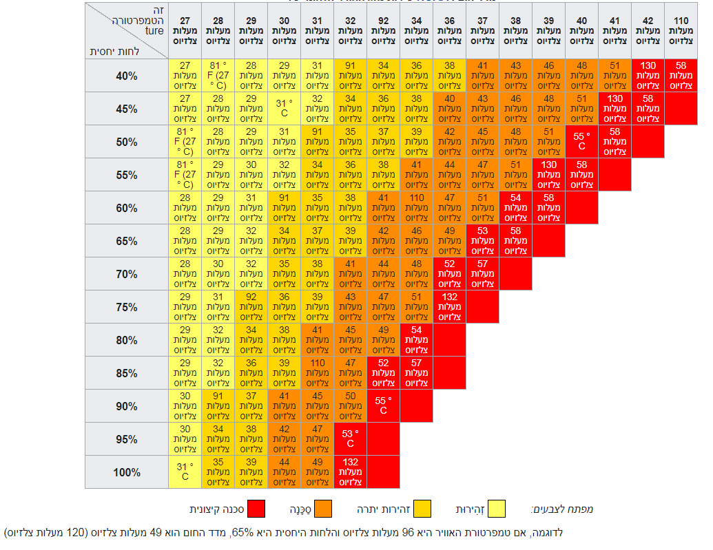 - טבלה של אינדקס חום. שילוב טמפרטורה ולחות... יהודה א