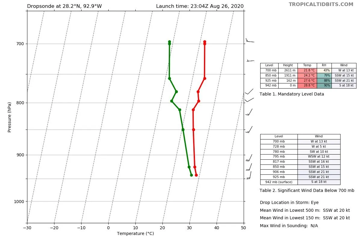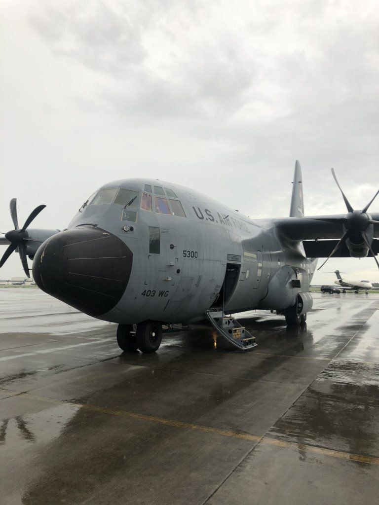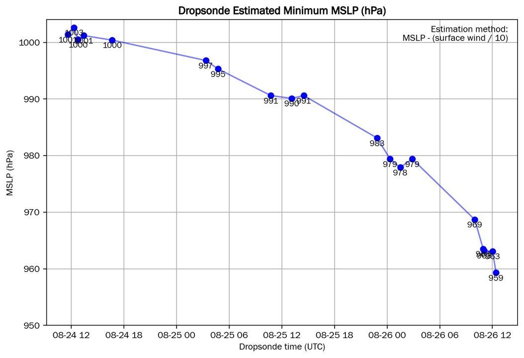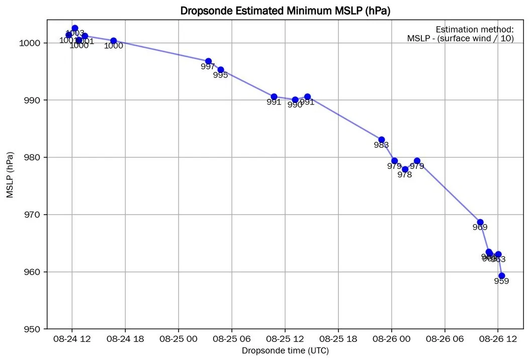 בשעה זו מטוס ציידי ההוריקנים של NOAA בוחן את הוריקן לורה במטרה לבדוק אם יש שינוי בעוצמת הסופה.