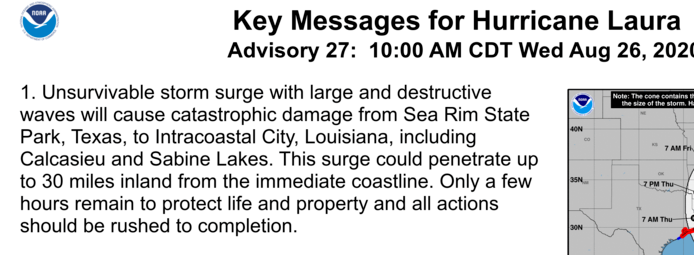 A strengthening Laura is now expected to reach Category 4 strength later this afternoon, before making landfall as a strong Category 3 storm in Cameron Parish with winds up at 120 mph.