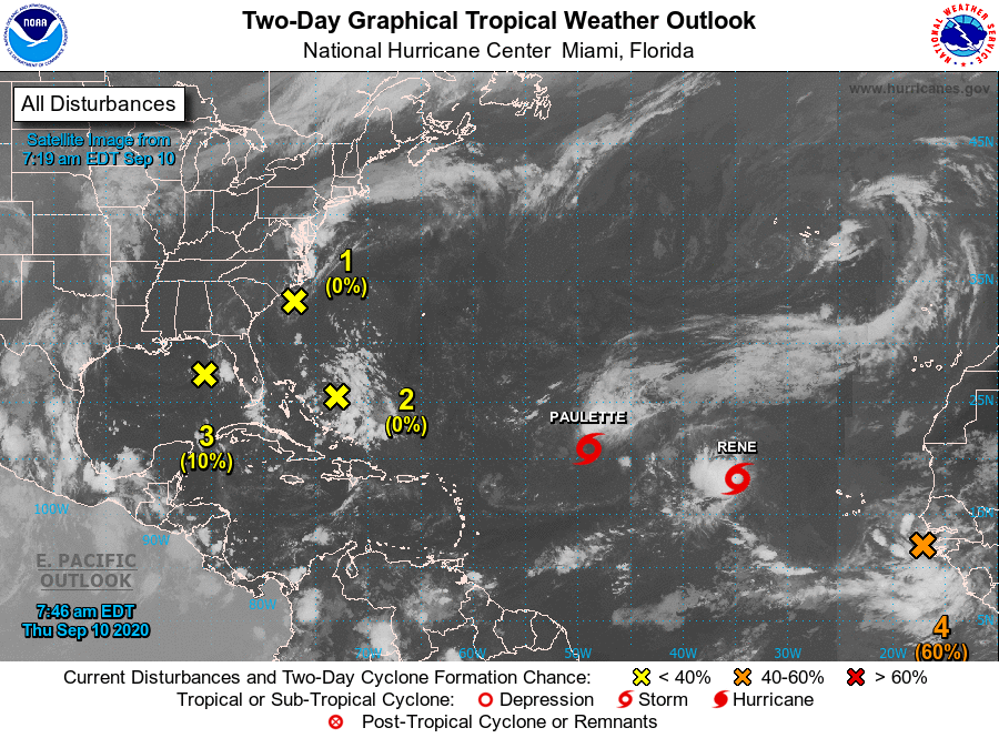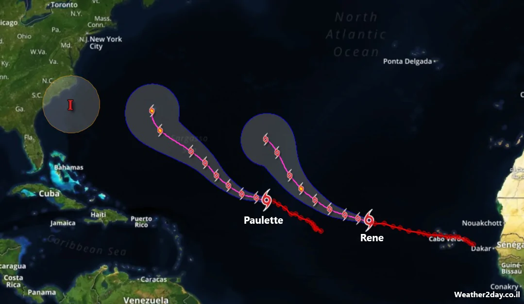 הסופה הטרופית Rene נמצאת ממזרח לסופה Paulette באותו מסלול וכנראה שתיהן תוצר של אותו גל שהגיח ממערב אפריקה. Rene צפויה אף היא להפוך להוריקן ביום שבת הקרוב ומסלולה הצפוני יחסית ל-Paulette לא מבטיח שהיא תחזיק מעמד, נעקוב ונעדכן במידת הצורך.