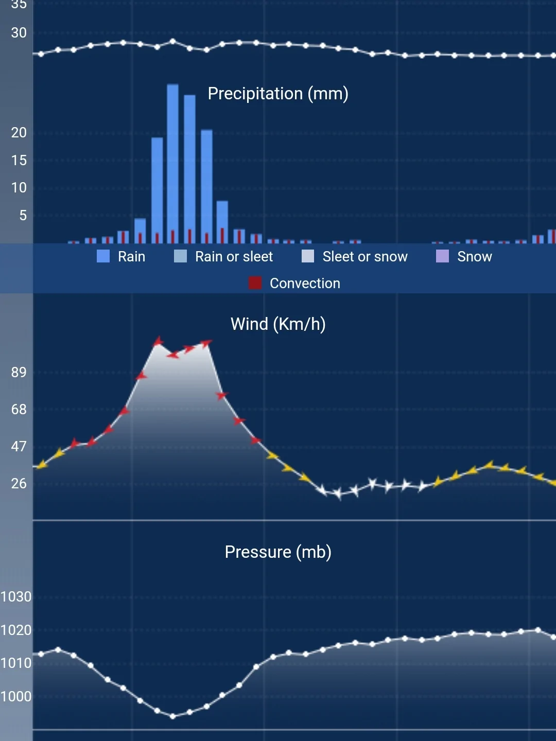 שימו לב לשקע במהירות השיא של הרוח. זה אומר שהעין של paulette תעבור מעליהם