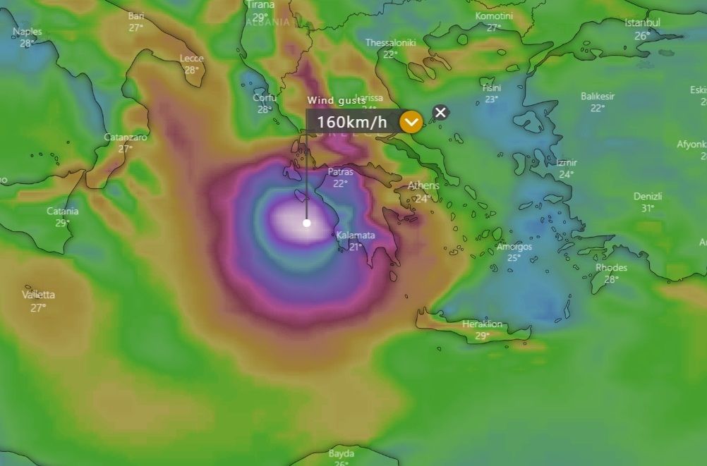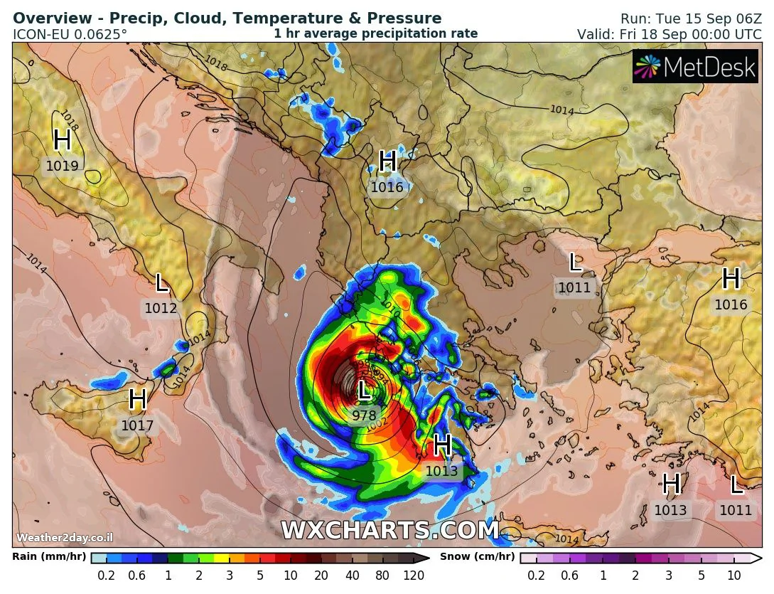 בתמונה: מודל ICON עם צפי חמור ביותר למערב יוון