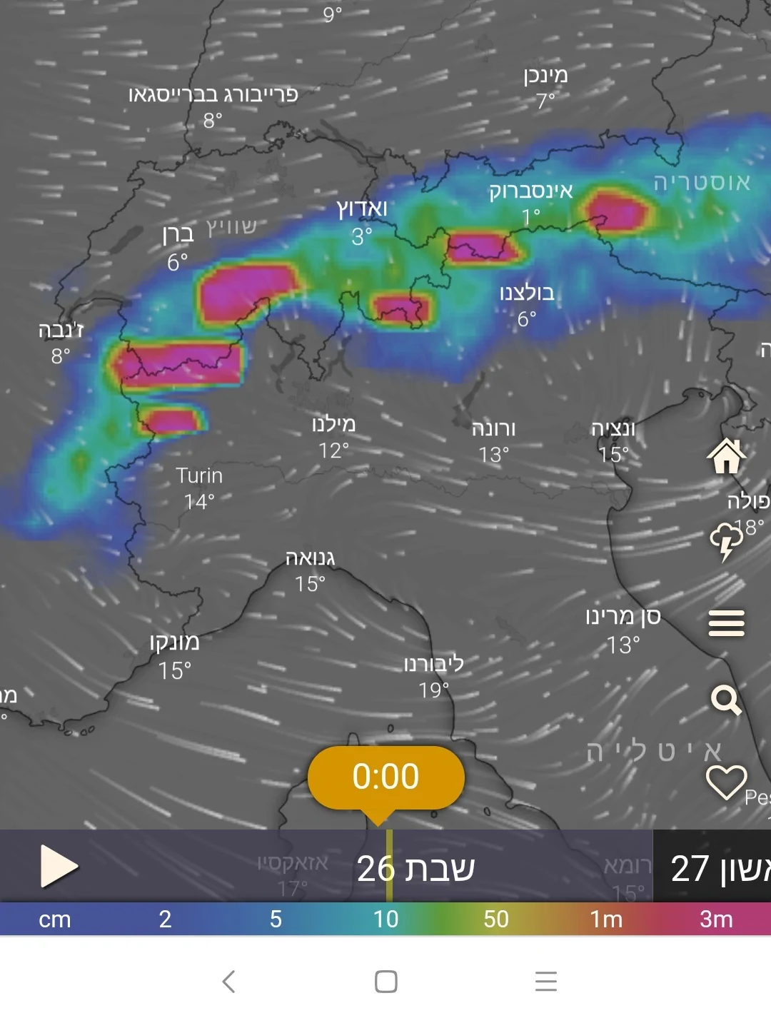 - שלג יורד כרגע ברחבי האלפים מגובה של 1200 מטר ואף 1000 בחלק מהאזורים. אלעד 2
