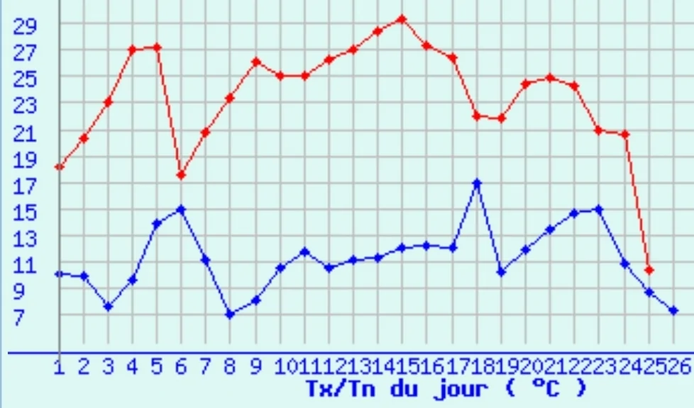 - גרפים של טמפ' מקסימום וטמפ' מינימום בפריז ובציריך מתחילת ספטמבר אבי (פרדס כץ)