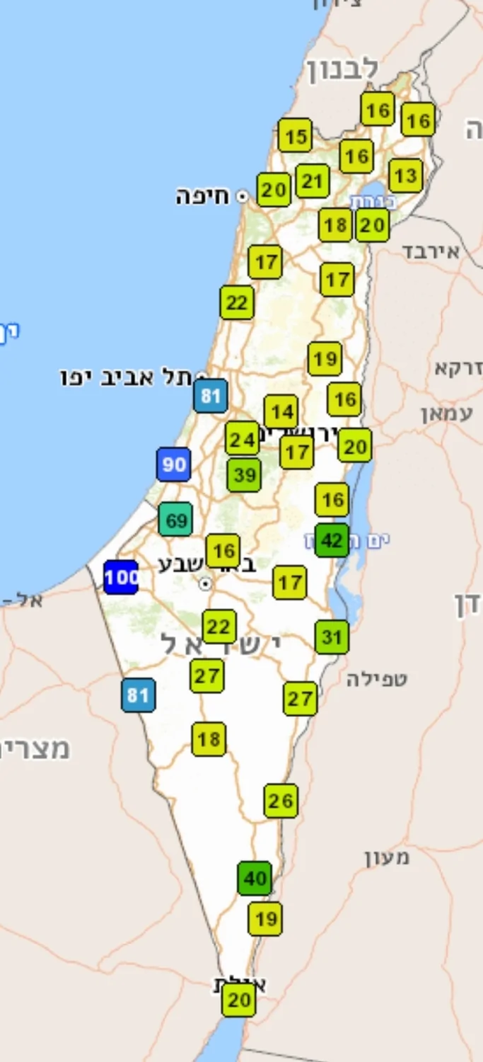 בכנרת ואזור בית שאן 41-42, בגלבוע ודרום הגולן 37, קרוב ל40 גם בשפלה